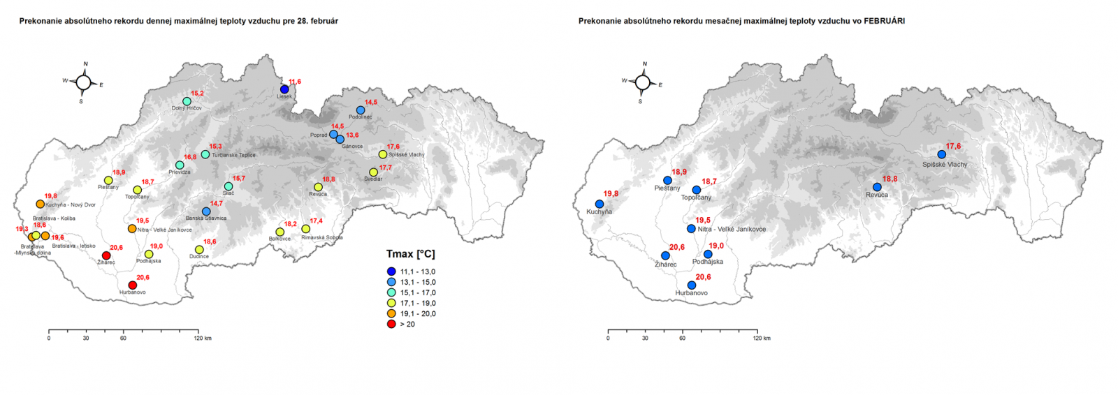 Obr. 1: Meteorologické stanice s prekonanými rekordmi maximálnej teploty vzduchu pre 28. február (vľavo) a mesiac február (vpravo) [Zdroj: SHMÚ]