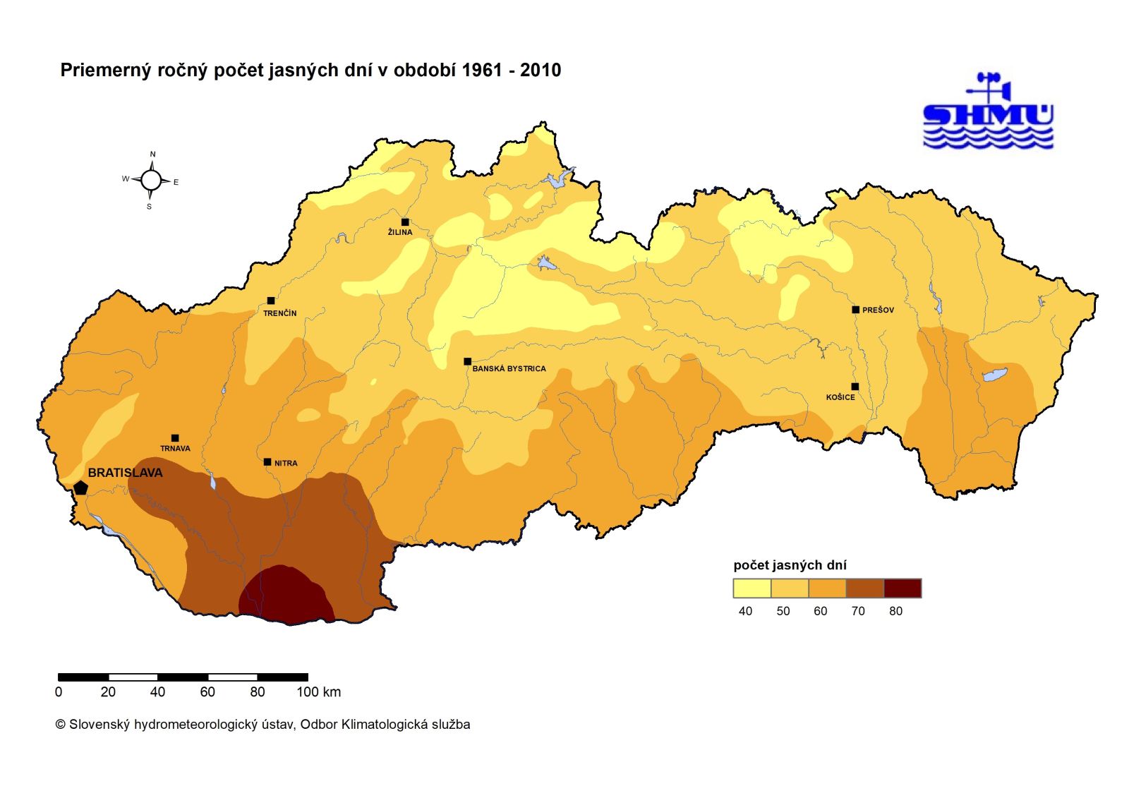 Najviac jasných dní na území Slovenska je v Podunajskej nížine, a to 60 až 75 dní v roku. Najmenej ich je v horských a kotlinových oblastiach severného a východného Slovenska a v Nízkych Tatrách, a to menej ako 40 dní. V priebehu roka máme v nížinách a kotlinách Slovenska najviac jasných dní v mesiaci august, najmenej v mesiaci november. V horských oblastiach je najviac jasných dní v októbri a najmenej v júni.
