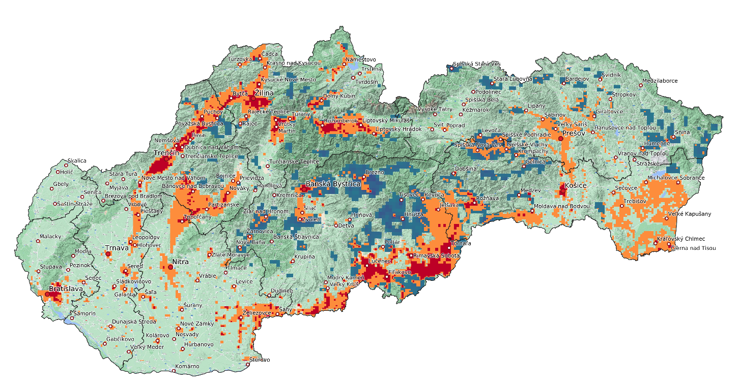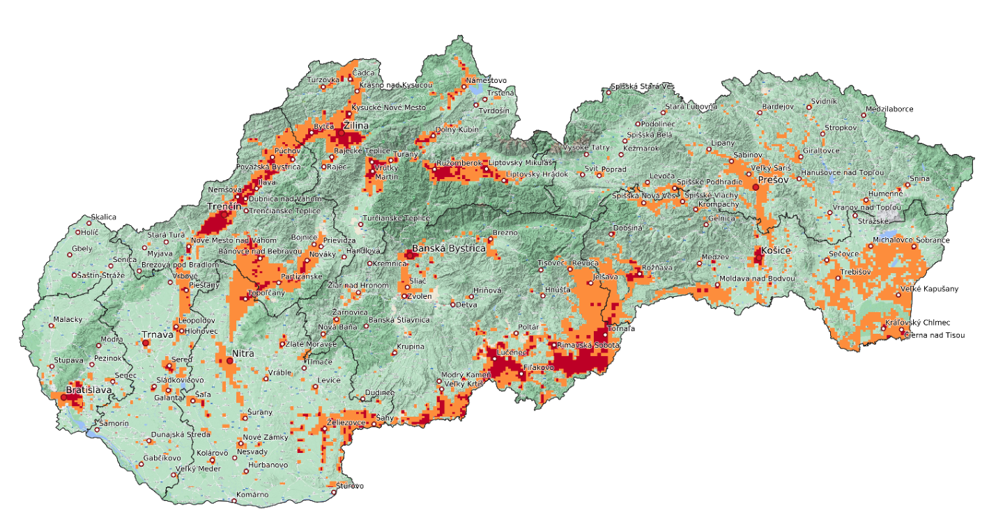 Poznámka: Mapa zobrazuje katastre obce a okresy, ktoré sú vymedzené ako ORKO. Opatrenia je potrebné zamerať na oblasti, kde je pravdepodobná vyššia expozícia obyvateľstva, teda na zastavané územia obcí a miest (tzn. intravilán).