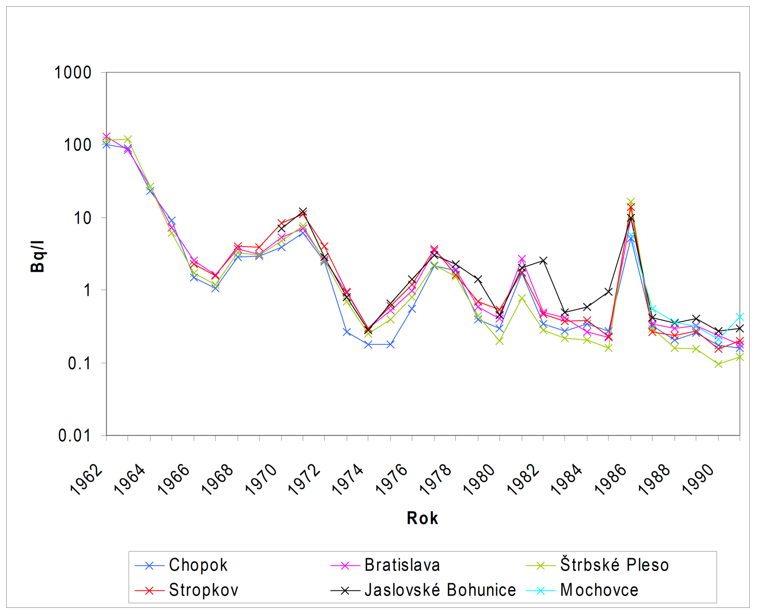 Maximálne hodnoty na našom území boli namerané roku 1962, čo sa zhoduje s celkovou situáciou vo svete, keďže išlo o globálny spad a korešponduje to aj s počtom uskutočnených nadzemných jadrových pokusov v tomto roku, ako dokumentuje Obr. 1.