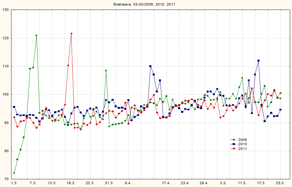Obr. 5 Príkon dávkového ekvivalentu gama žiarenia, Bratislava, 2009 – 2011