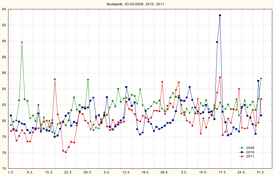 Obr. 6 Príkon dávkového ekvivalentu gama žiarenia, Budapešť, 2009 - 2011