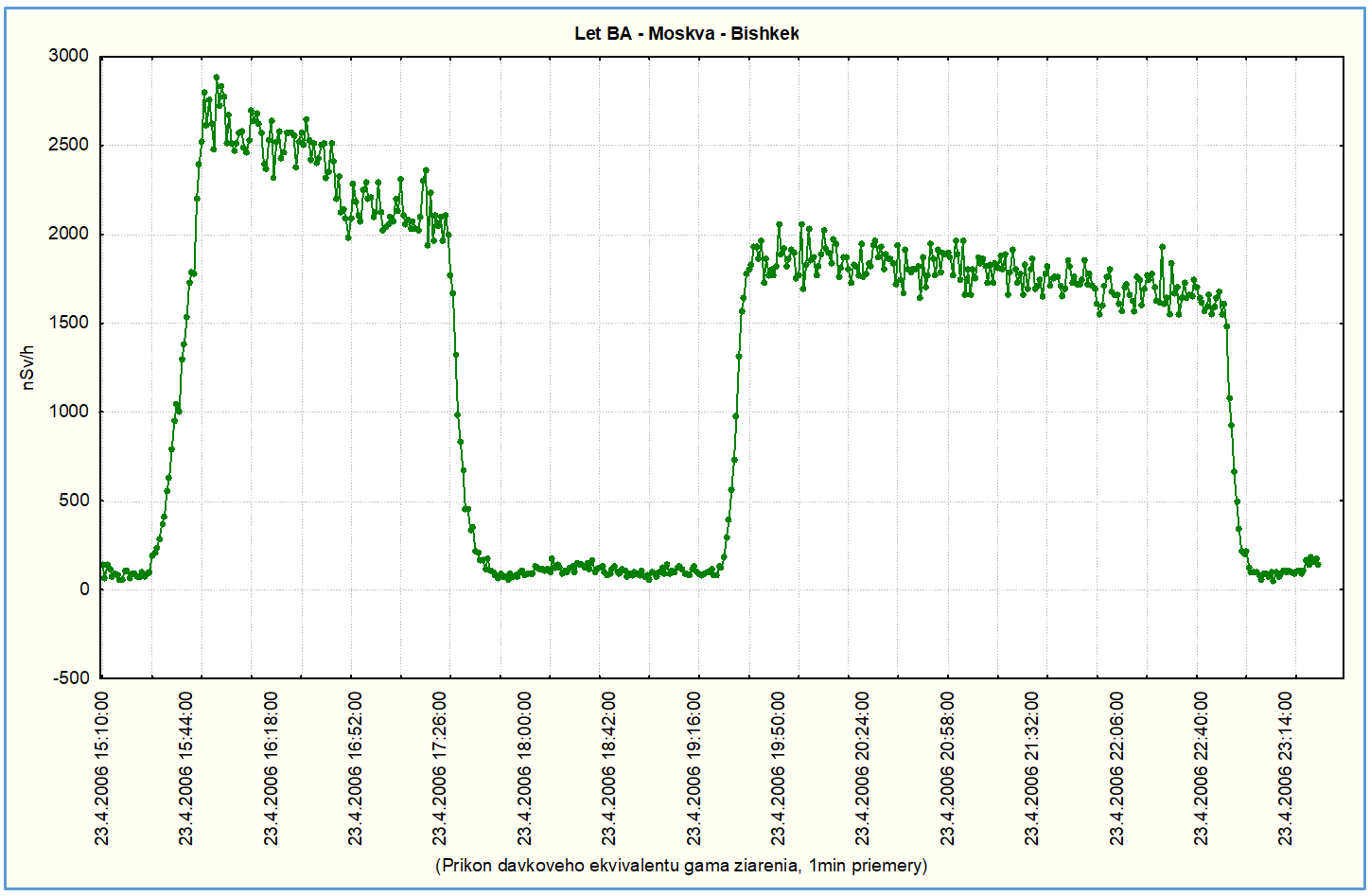 Aby bolo možné laicky porovnať hodnoty z obdobia Fukušimskej havárie, na obr. 6 je možné pozorovať zmenu úrovne príkonu dávkového ekvivalentu gama žiarenia, ktorá bola zaznamenaná sondou RPSG-05 na trase Bratislava-letisko, Moskva, Biškek.