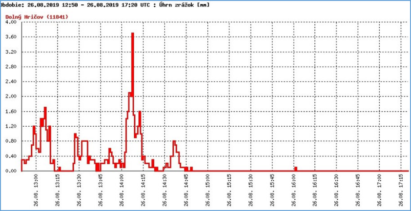 Výskyt zrážok hlavne po dlhšom období sucha, kedy dochádza k vymývaniu rádionuklidov z atmosféry a k vytlačeniu pôdneho vzduchu, ktorý obsahuje radón. To zachytí sonda v podobe viditeľného zvýšenia hodnôt dávkového príkonu. Na obrázkoch vidíme vľavo hodnoty dávkového príkonu zo stanice Žilina – Hričov a zrážky z informačného klimatologického systému, ktoré dokladujú situáciu v rovnakom čase.
