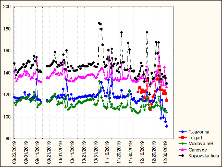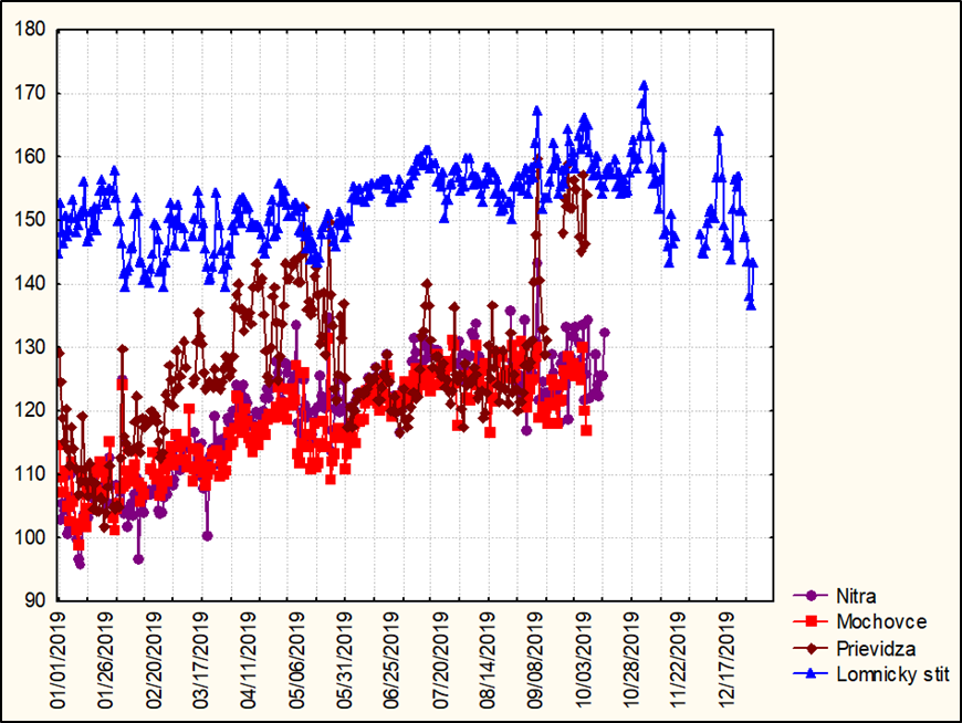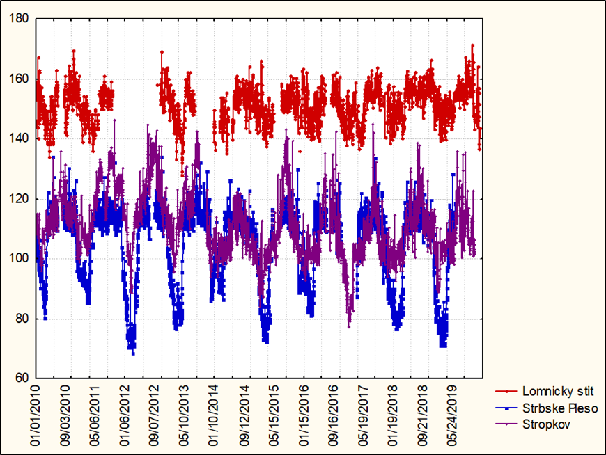 Vplyv topenia snehovej pokrývky, ktorá blokuje na radón bohatý pôdny vzduch. Po jeho uvoľnení v jarnom období dochádza k nárastu hodnôt dávkového príkonu, ako je to možné pozorovať na časovom rade 2010 – 2019 – minimá v zime, maximá v lete.