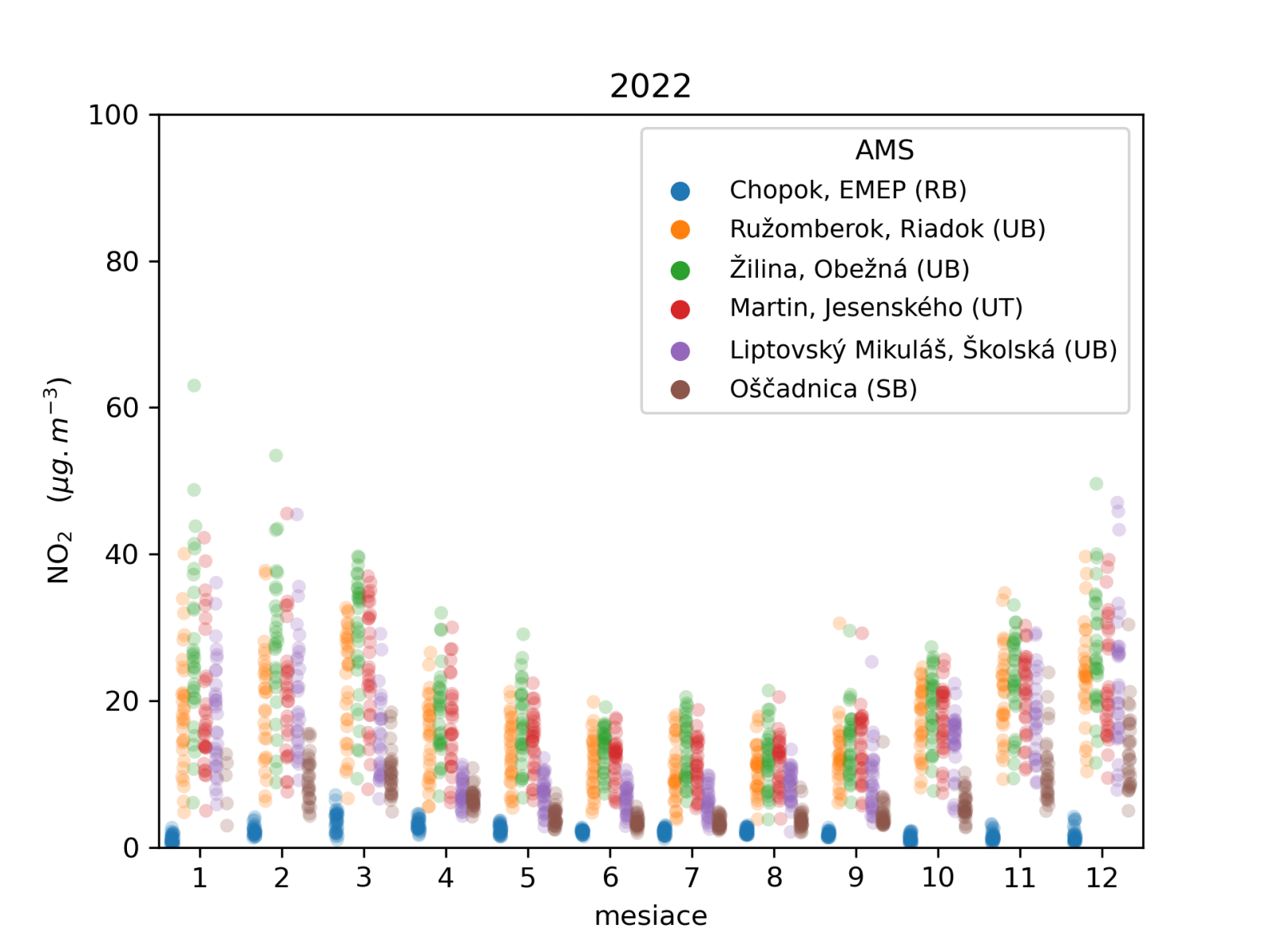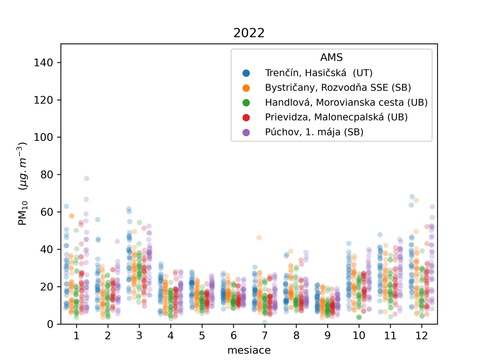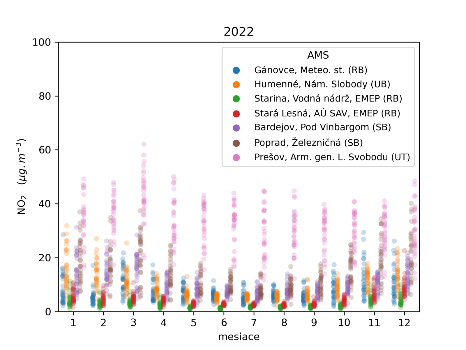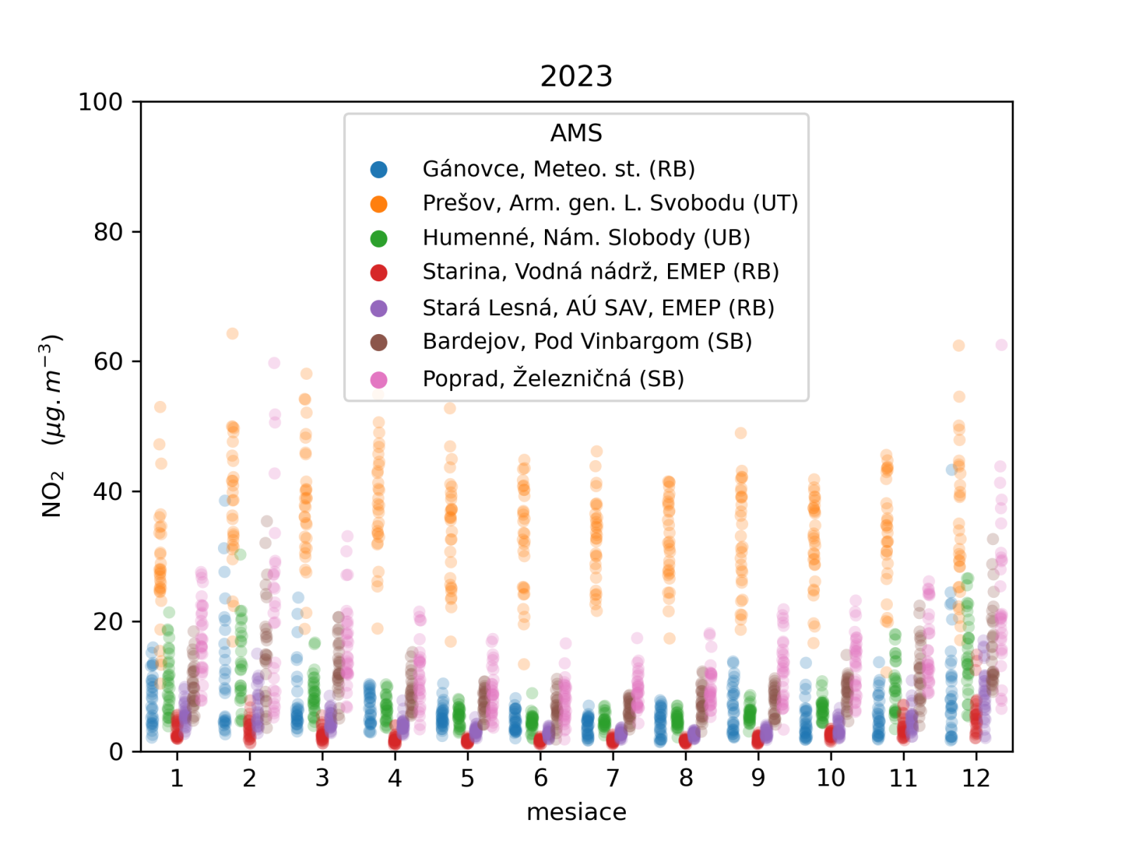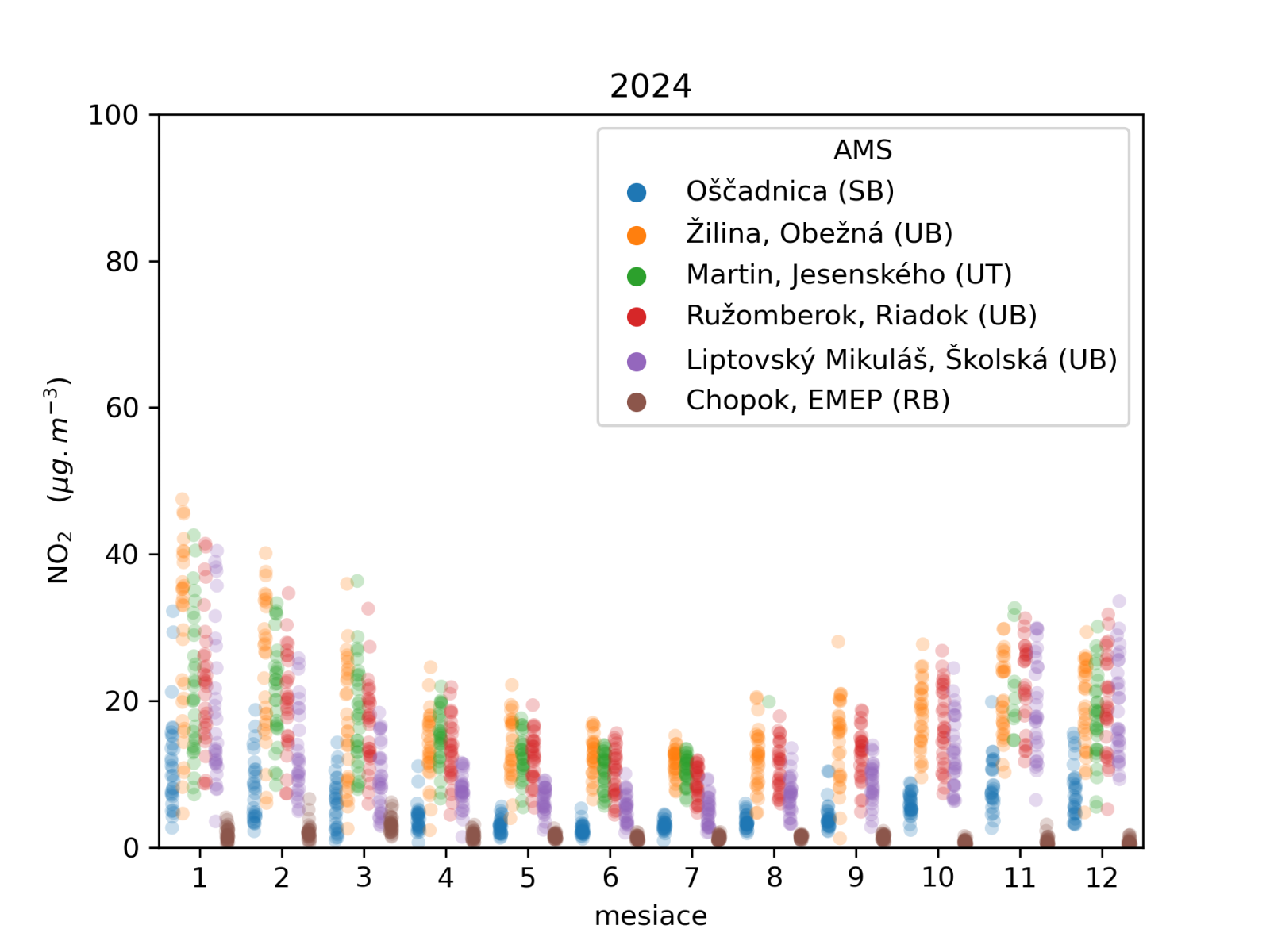 Poznámka: Pre účely hodnotenia kvality ovzdušia je územie Slovenska rozdelené na aglomerácia a zóny, rozdelenie je popísané na web stránke SHMÚ.V grafoch je v legende pri monitorovacej stanici v zátvorke uvedený typ oblasti a stanice.