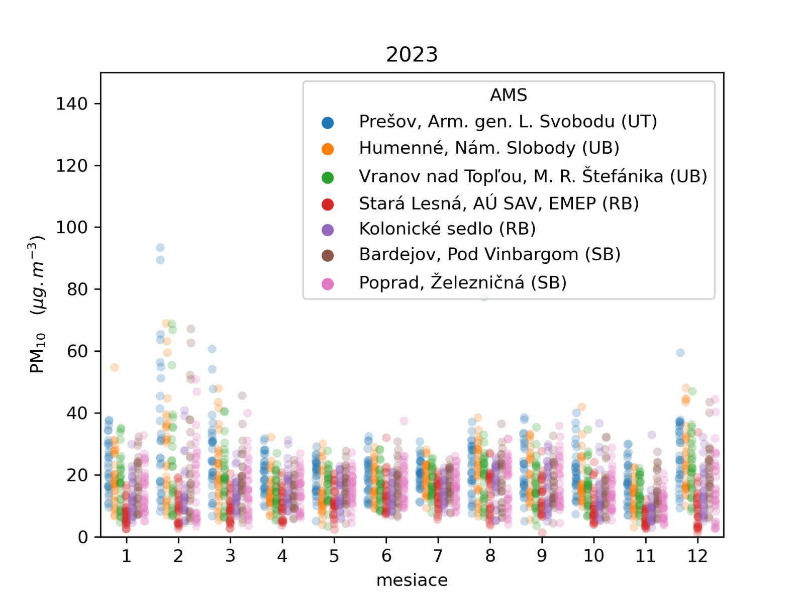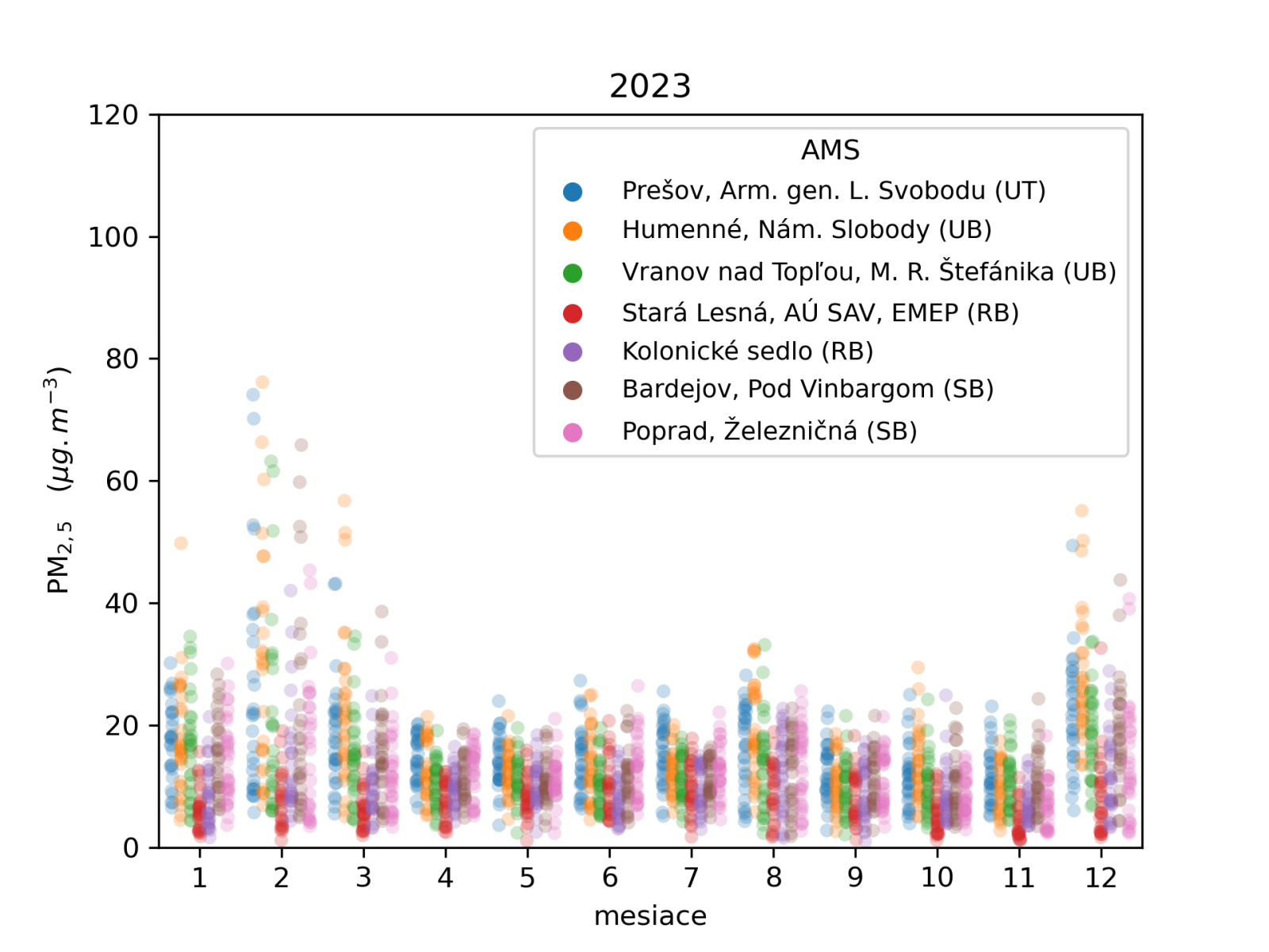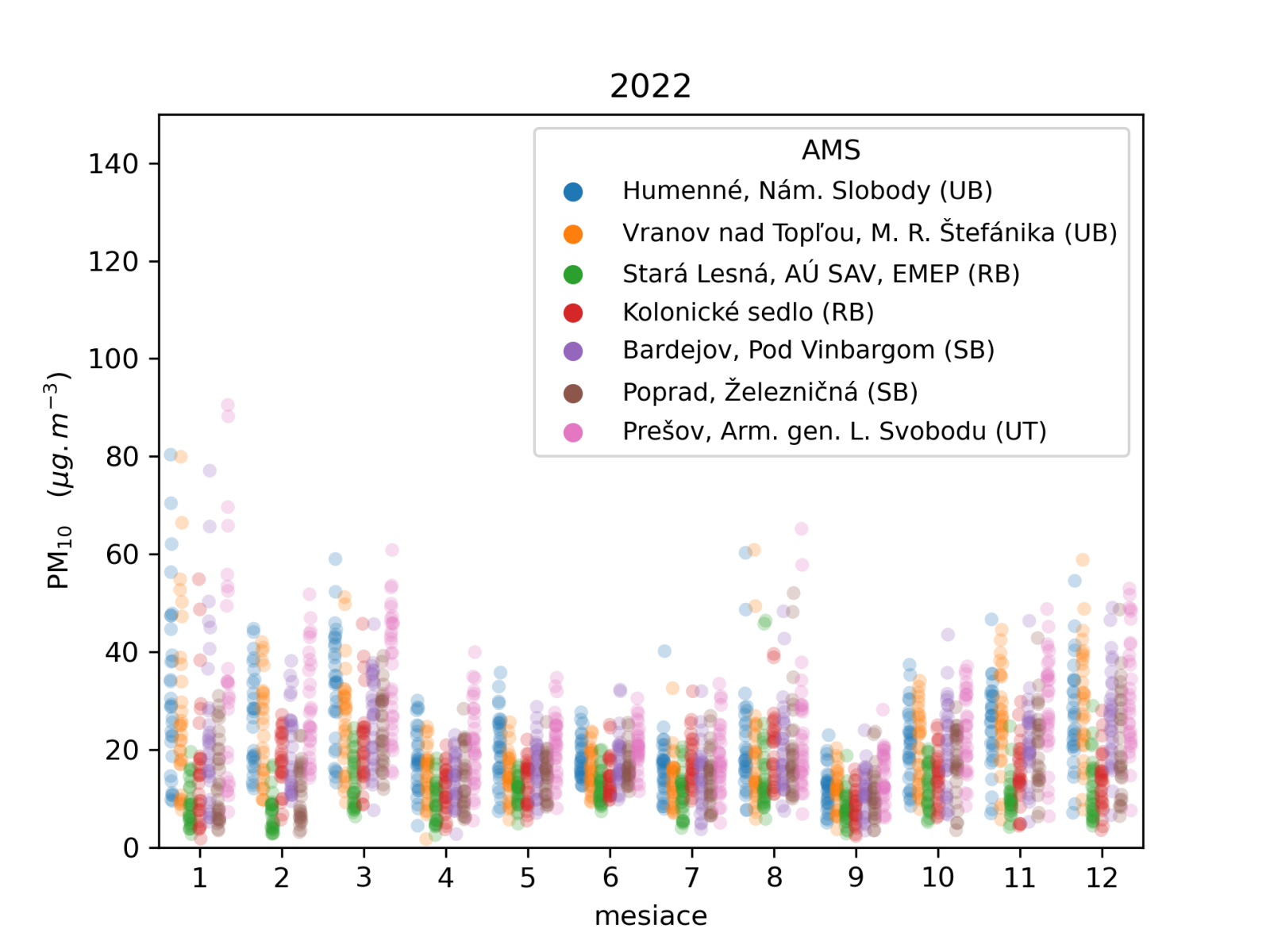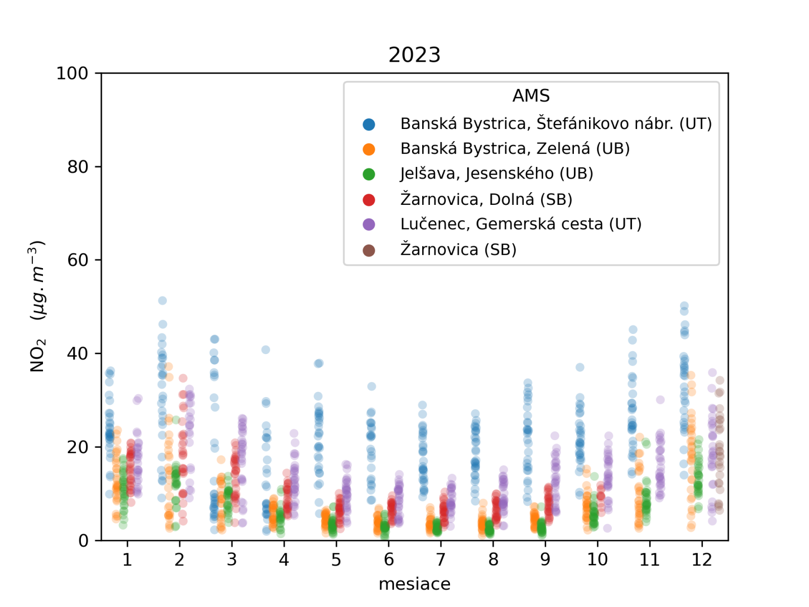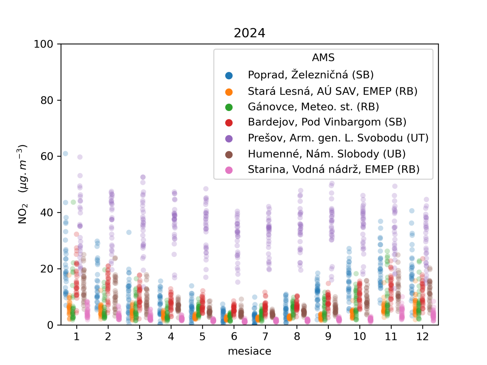 Poznámka: Pre účely hodnotenia kvality ovzdušia je územie Slovenska rozdelené na aglomerácia a zóny, rozdelenie je popísané na web stránke SHMÚ.V grafoch je v legende pri monitorovacej stanici v zátvorke uvedený typ oblasti a stanice.