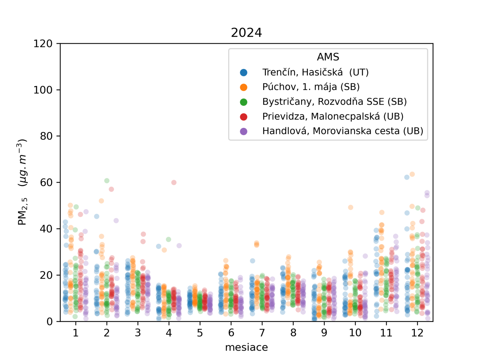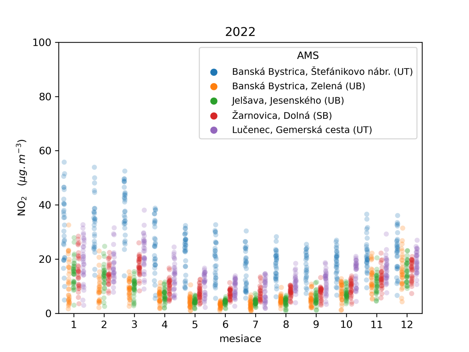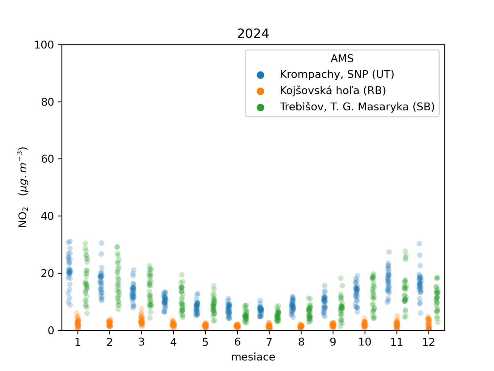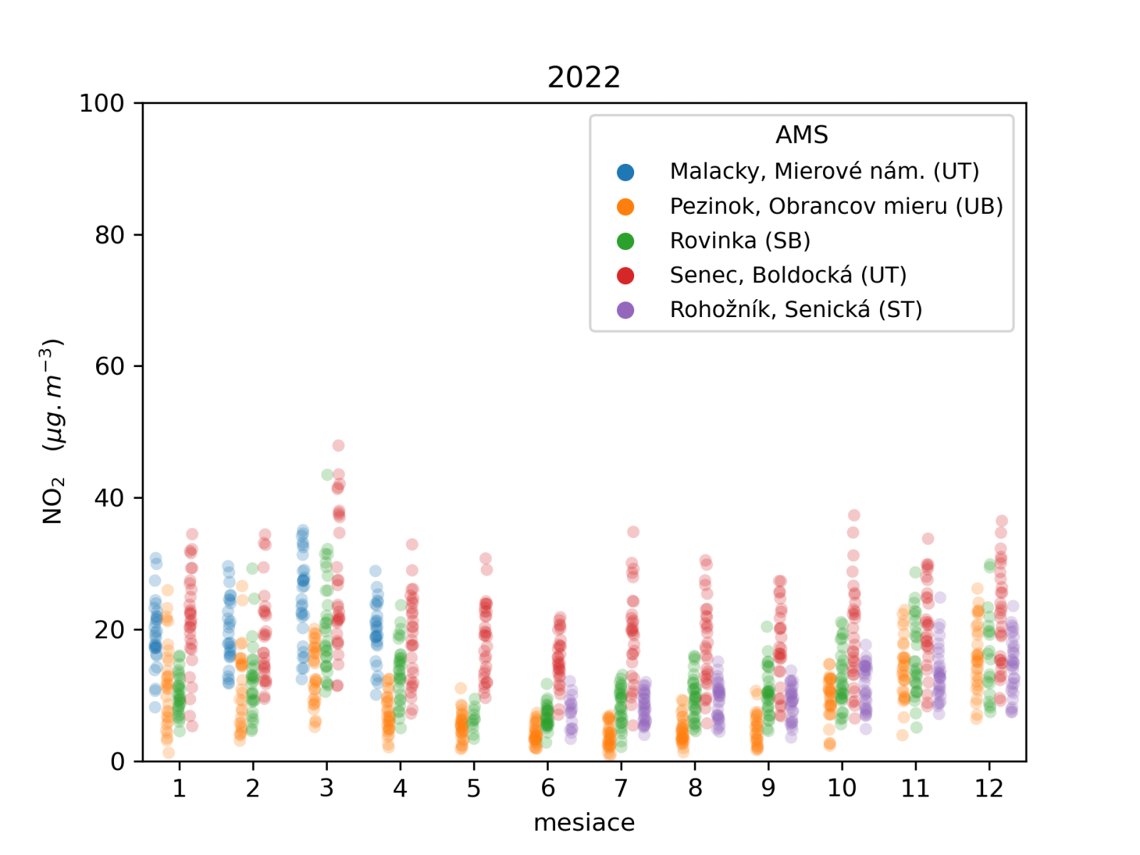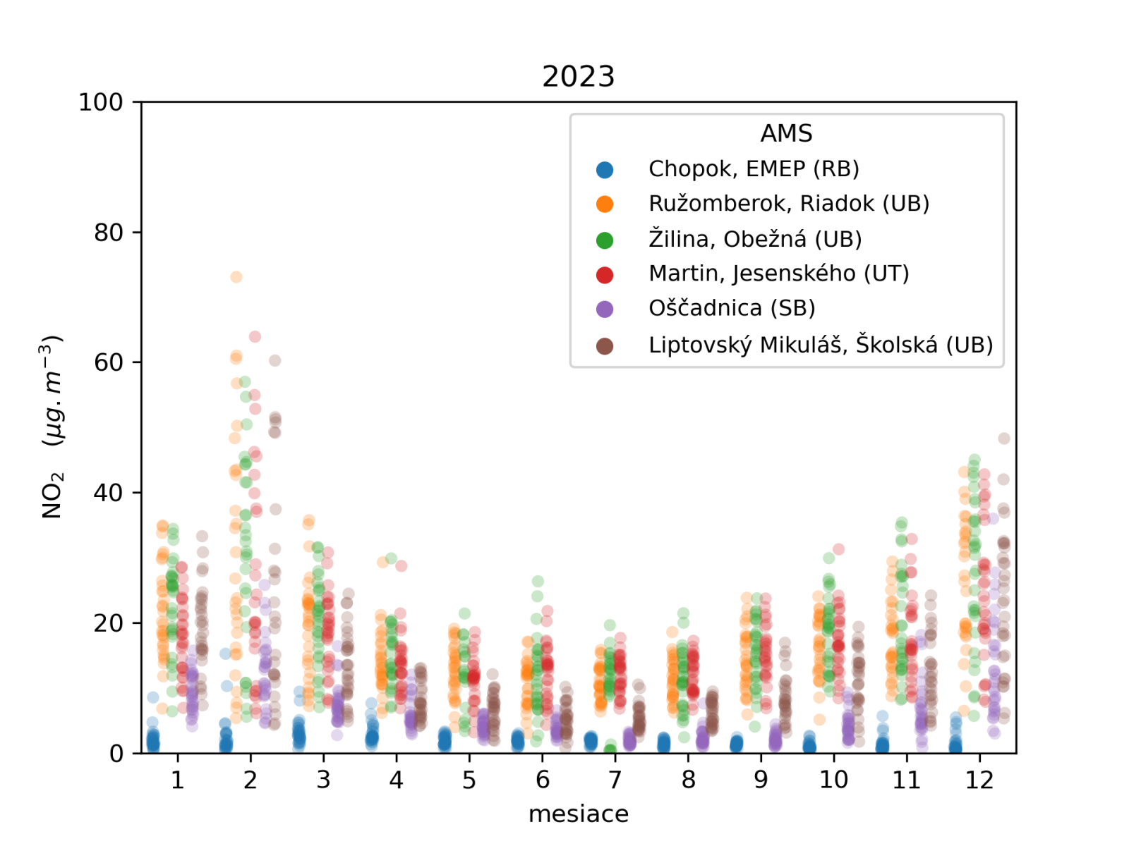 Poznámka: Pre účely hodnotenia kvality ovzdušia je územie Slovenska rozdelené na aglomerácia a zóny, rozdelenie je popísané na web stránke SHMÚ.V grafoch je v legende pri monitorovacej stanici v zátvorke uvedený typ oblasti a stanice.