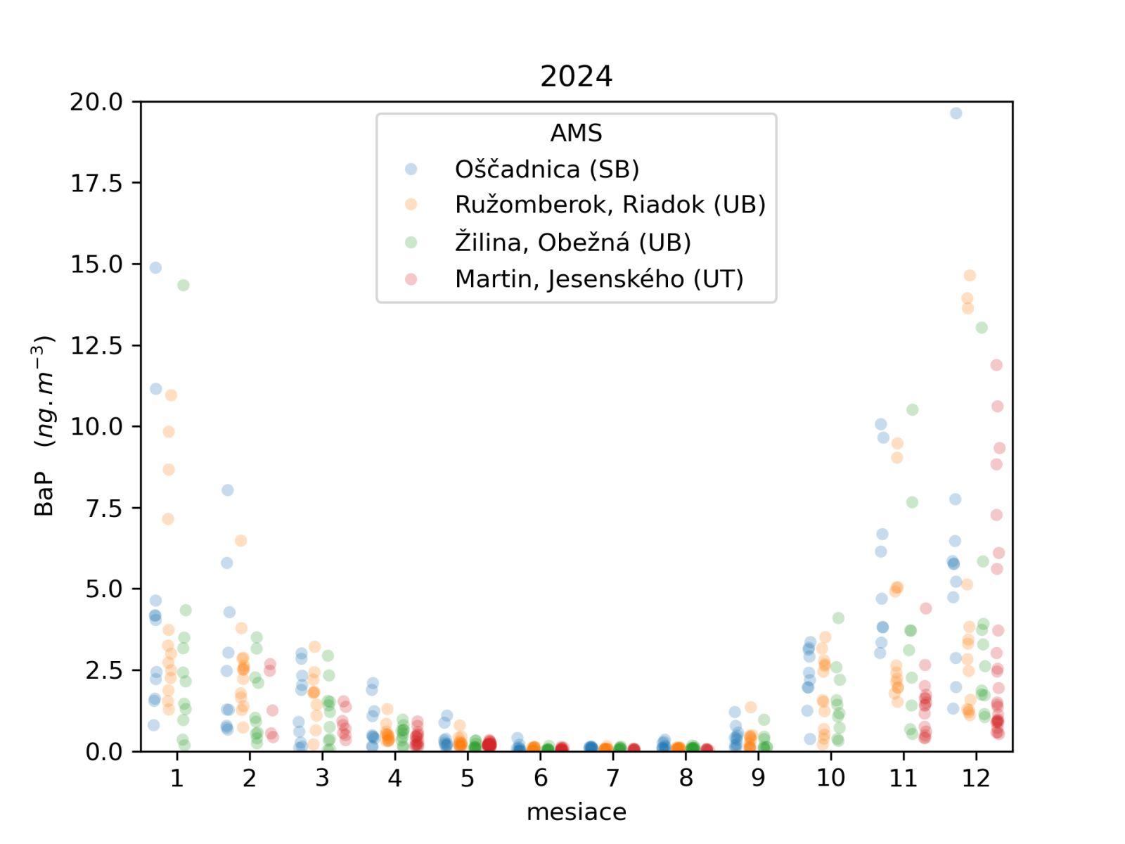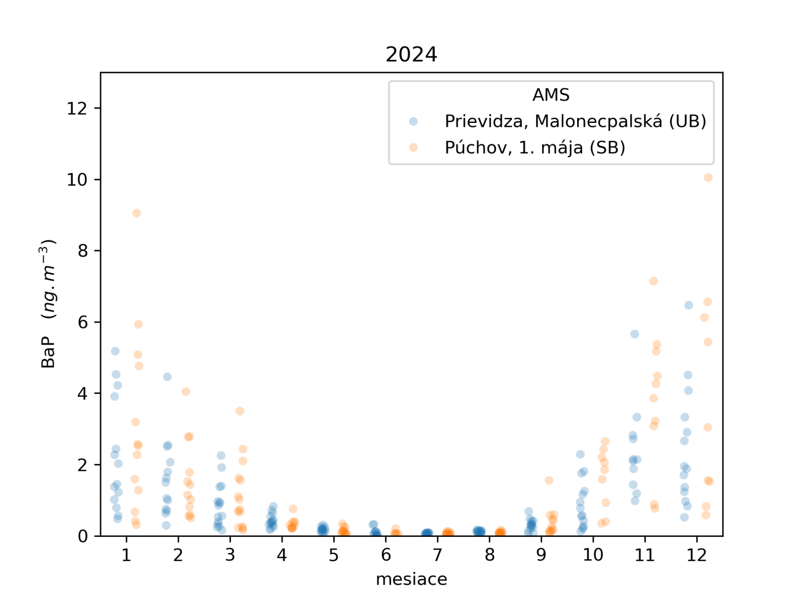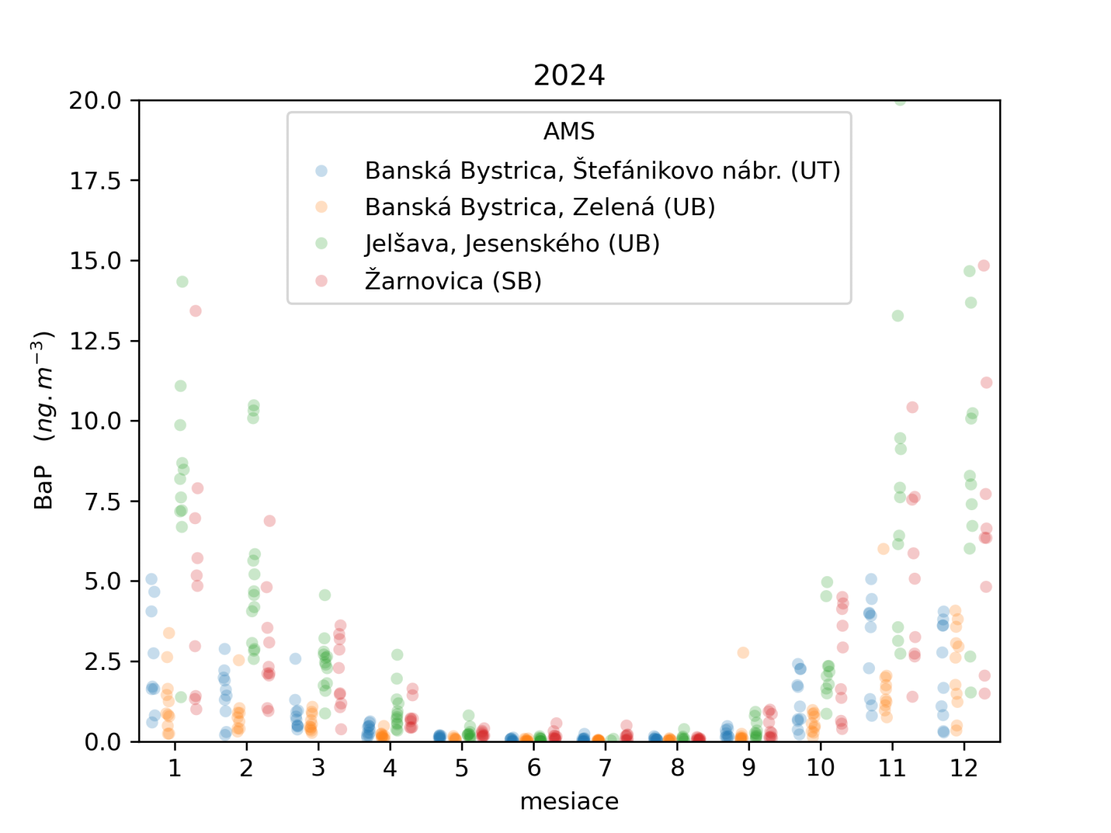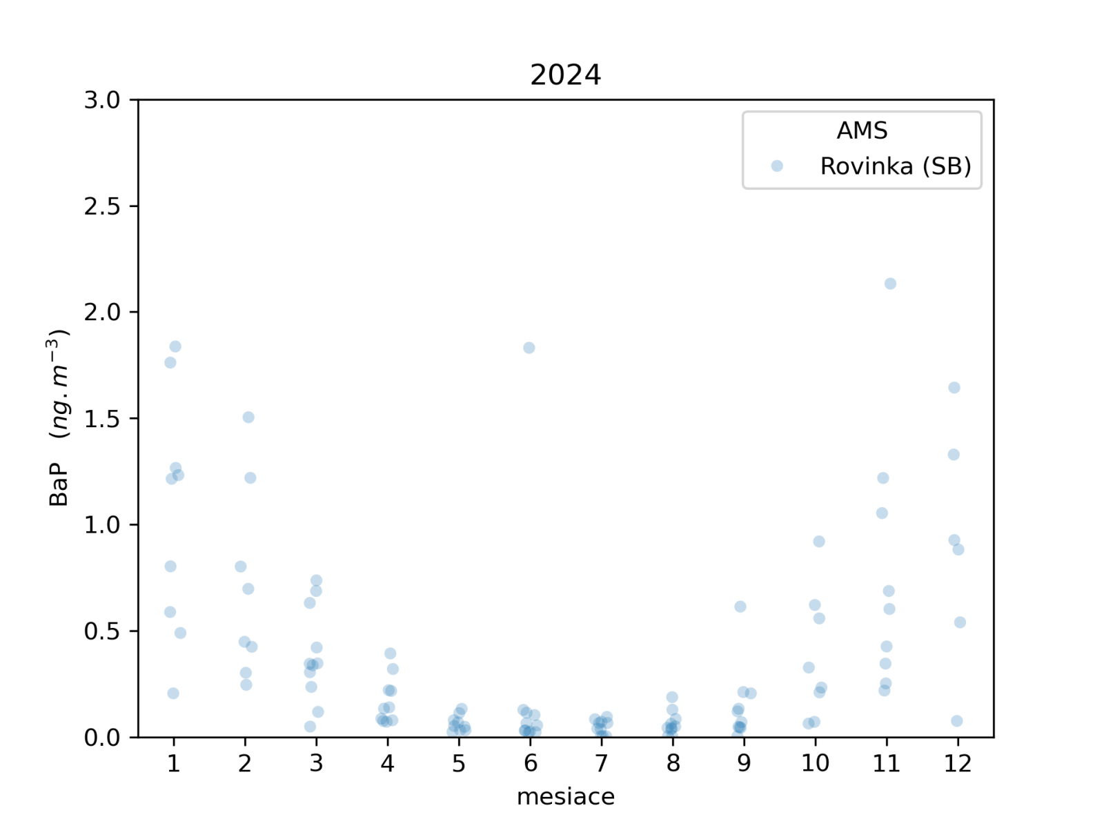 | Priemerné denné koncentrácie PM10, PM2,5, benzo[a]pyrénu (BaP), NO2 a O3 v roku 2024 | Priemerné denné koncentrácie PM10, PM2,5, benzo[a]pyrénu (BaP), NO2 a O3 v roku 2023 | Priemerné denné koncentrácie PM10, PM2,5, benzo[a]pyrénu (BaP), NO2 a O3 v roku 2022 | ||