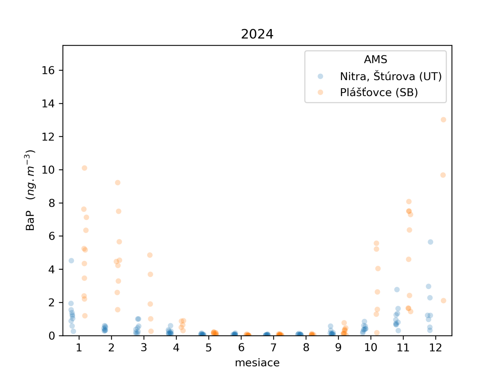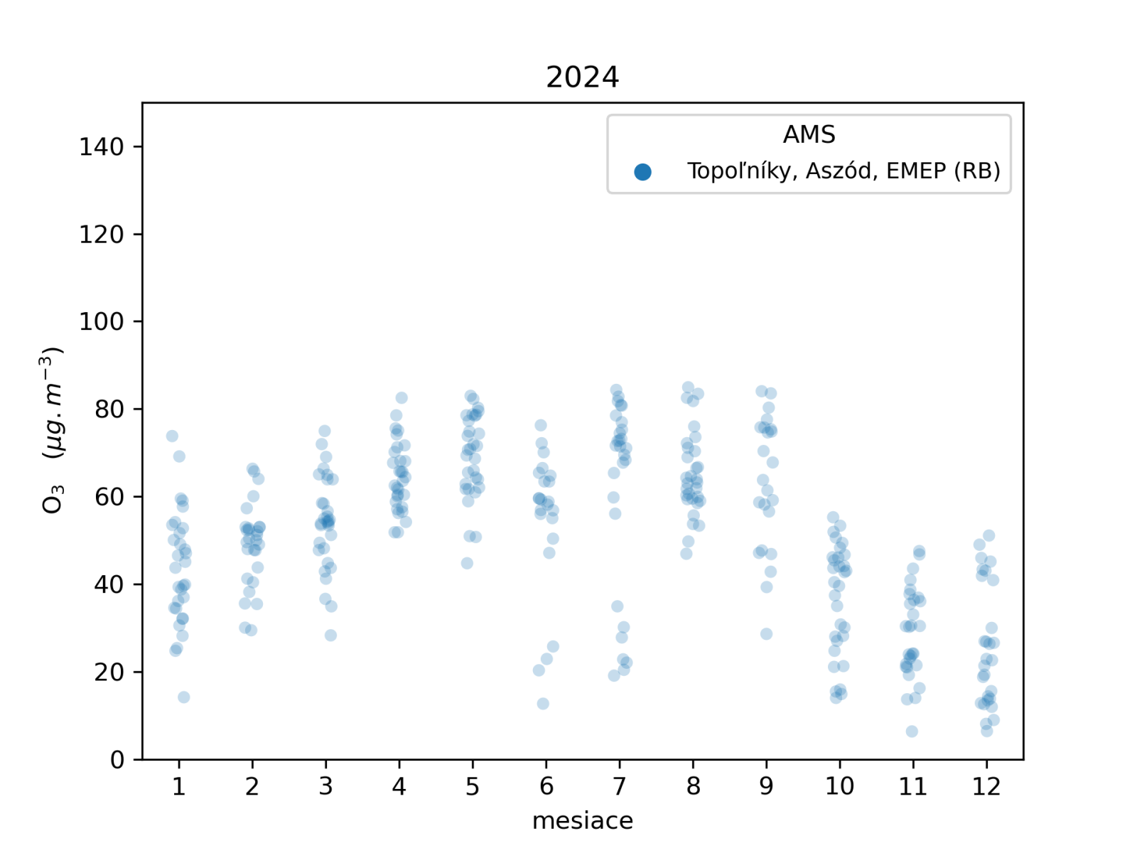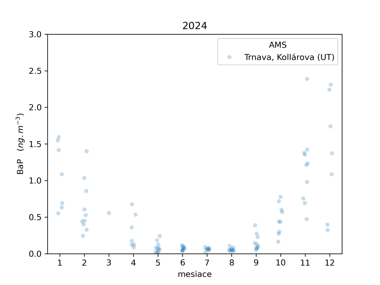 | Priemerné denné koncentrácie PM10, PM2,5, benzo[a]pyrénu (BaP), NO2 a O3 v roku 2024 | Priemerné denné koncentrácie PM10, PM2,5, benzo[a]pyrénu (BaP), NO2 a O3 v roku 2023 | Priemerné denné koncentrácie PM10, PM2,5, benzo[a]pyrénu (BaP), NO2 a O3 v roku 2022 | ||