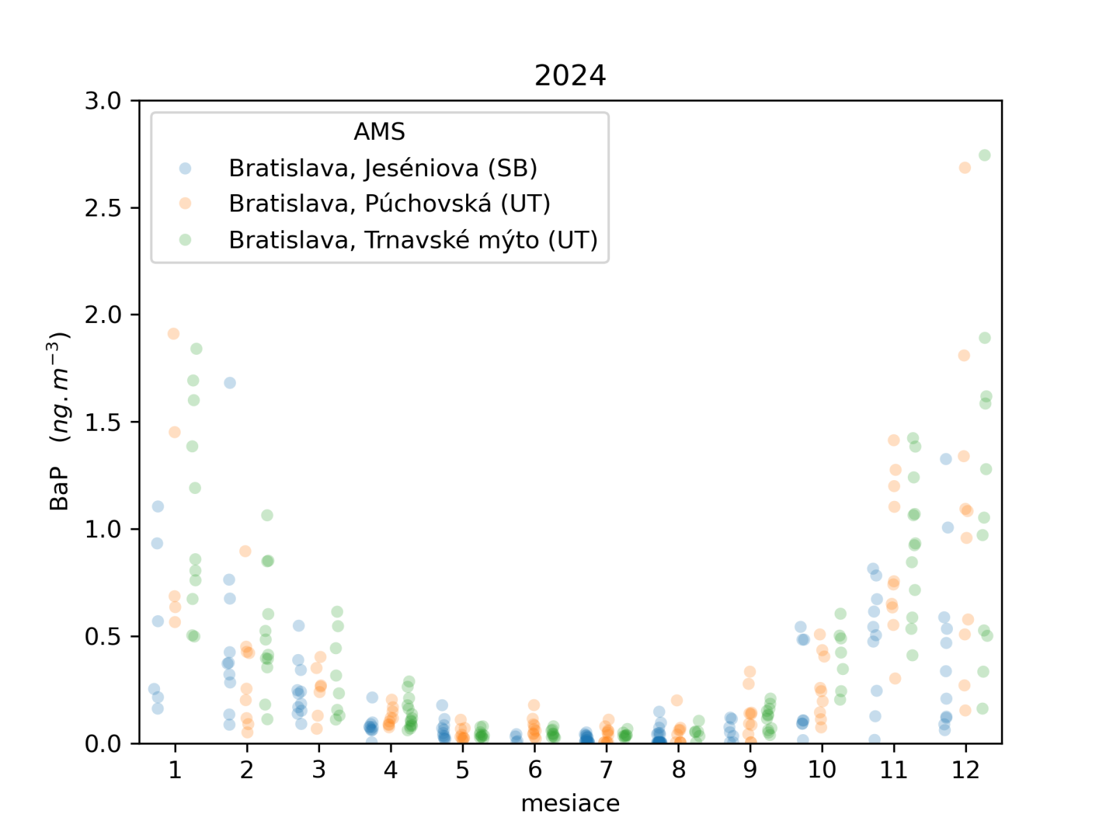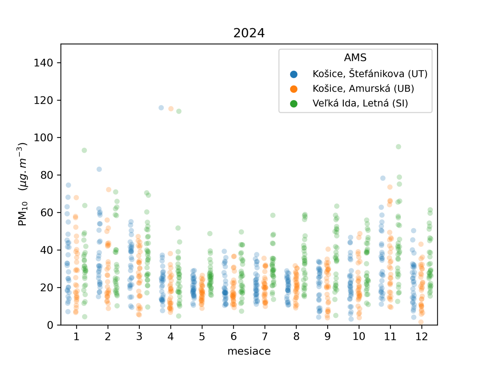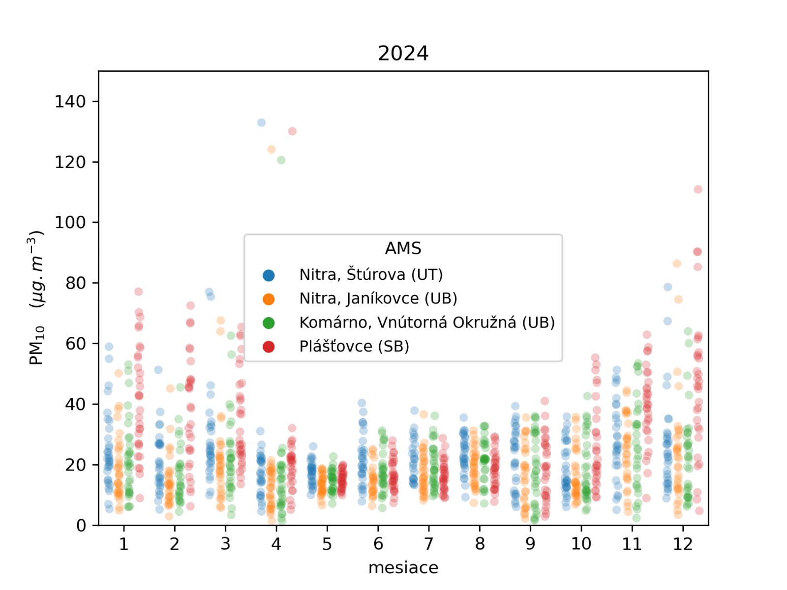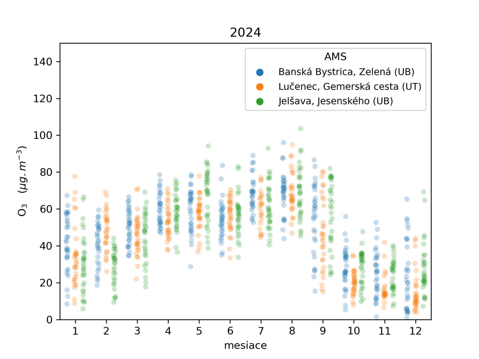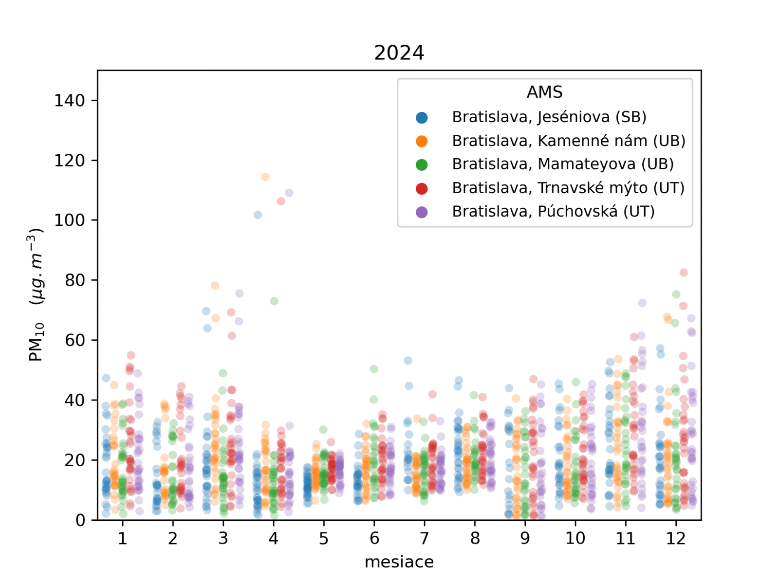 | Priemerné denné koncentrácie PM10, PM2,5, benzo[a]pyrénu (BaP), NO2 a O3 v roku 2024 | Priemerné denné koncentrácie PM10, PM2,5, benzo[a]pyrénu (BaP), NO2 a O3 v roku 2023 | Priemerné denné koncentrácie PM10, PM2,5, benzo[a]pyrénu (BaP), NO2 a O3 v roku 2022 |