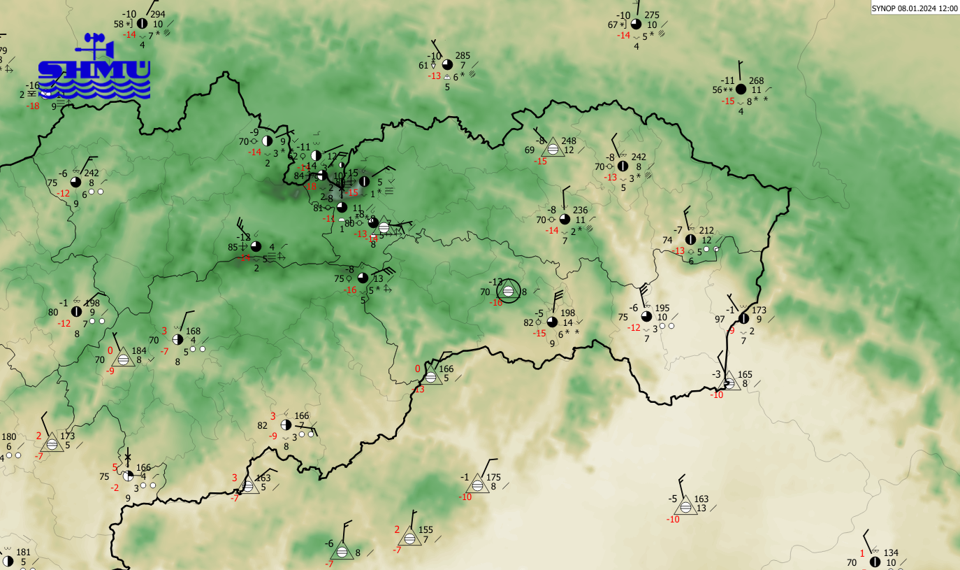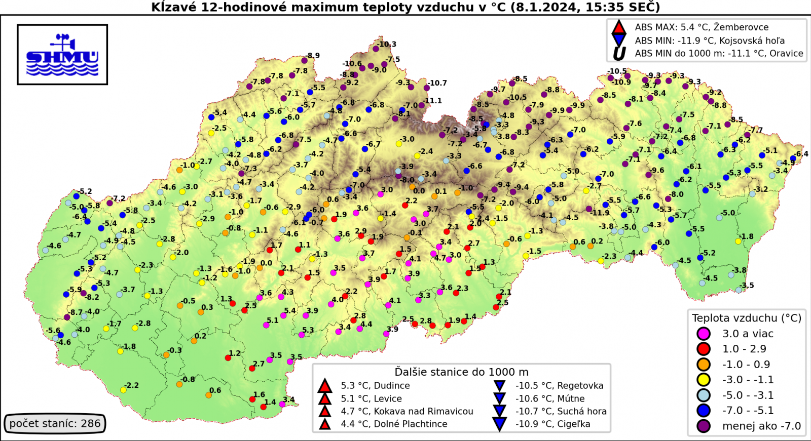 ▲ Obr. 4: Maximálna teplota vzduchu 8.1.2024. V záveterných oblastiach BB a NR kraja podstatne teplejšie ako na severe, východe a krajnom západe Slovenska.