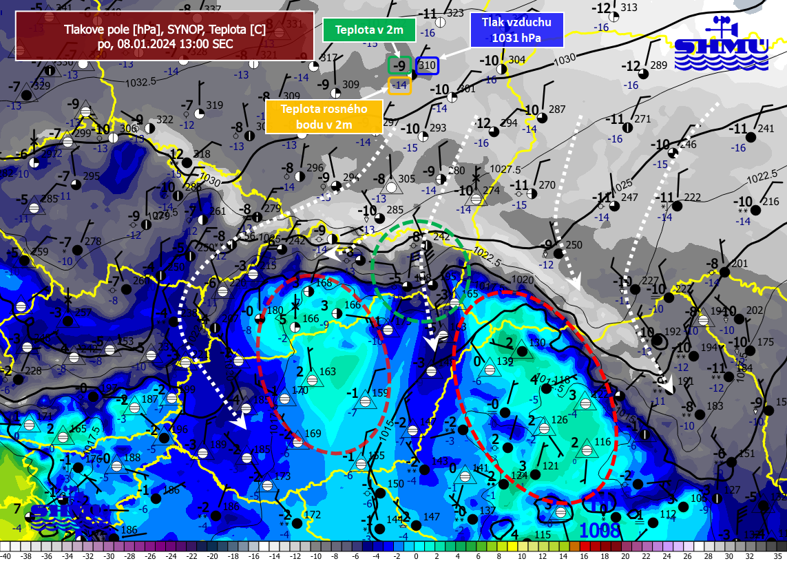 ▲ Obr. 1: Tlak vzduchu prepočítaný na hladinu mora, SYNOP a teplota vzduchu vo výške 2 m, 8.1.2024, 13:00 SEČ. Studený vzduch obchádza horské prekážky (biele prerušované šípky) a v lokálnych zníženinách zosilňuje, najsilnejšie v oblasti najsilnejšieho tlakového gradientu na východnom Slovensku (zelený kruh) - v priľahlom Poľsku tlak vzduchu 1028 hPa, v severovýchodnom Maďarsku 1016 hPa; v závetrí Karpát ostáva teplejší vzduch (červené elipsy); hore vysvetlené zobrazené veličiny z pozorovaní.