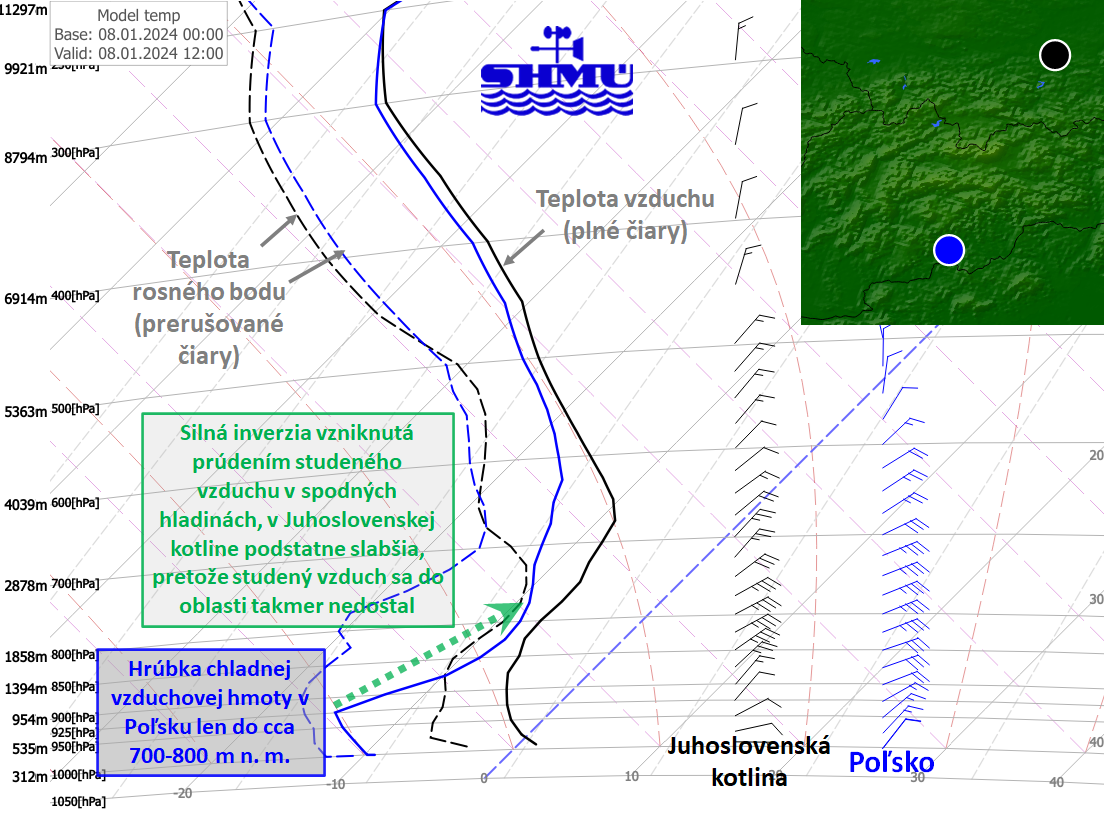 ▲ Obr. 5: Termodiagram pre južné Poľsko a Juhoslovenskú kotlinu, model ALADIN s vysokým horizontálnym rozlíšením 2 km, 8.1.2024, 13:00 SEČ. Plytká studená vzduchová hmota vyvolala v Poľsko silnú inverziu nad touto vrstvou, no do Juhoslovenskej kotliny sa cez Západné Karpaty dostala len nepatrne, teplota tak bola pri povrchu nad nulou a inverzia bola podstatne slabšia.