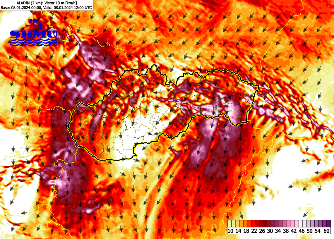 ▲ Obr. 6: Zosilnenie vetra v 10 m v lokálnych zníženinách podľa modelu ALADIN s vysokým horizontálnym rozlíšením 2 km, 8.1.2024, 13:00 SEČ.
