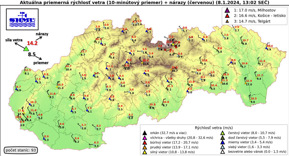 ▲ Obr. 3: Smer a rýchlosť vetra, hodnoty predstavujú priemernú rýchlosť a nárazy v m/s, 8.1.2024, 13:02 SEČ. Na smere vetra vidieť, ako prúdenie studeného vzduchu obchádza pohoria, najmä Západné Karpaty - napr. na západnom Slovnesku je v TN kraji prevažne severovýchodný vietor, smerom na juh sa stáča na severozápadný až západný. V BB kraji v západnej časti prevažuje severozápadný, vo východnej časti kraja severovýchodný vietor, atď.