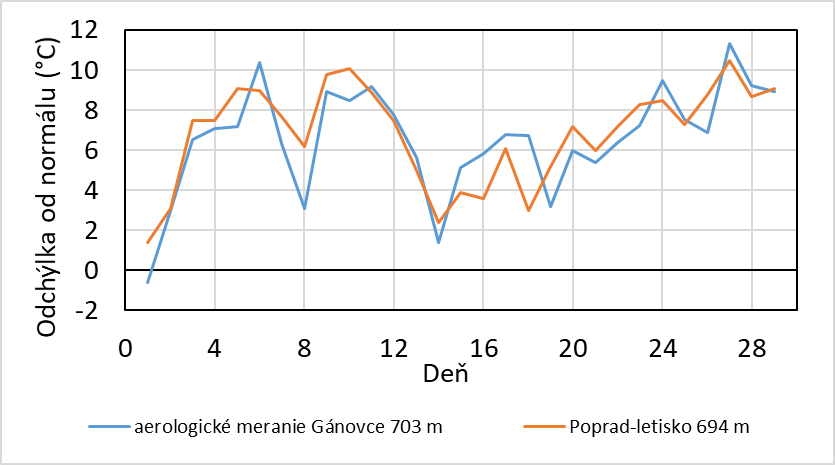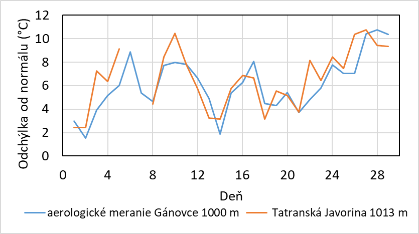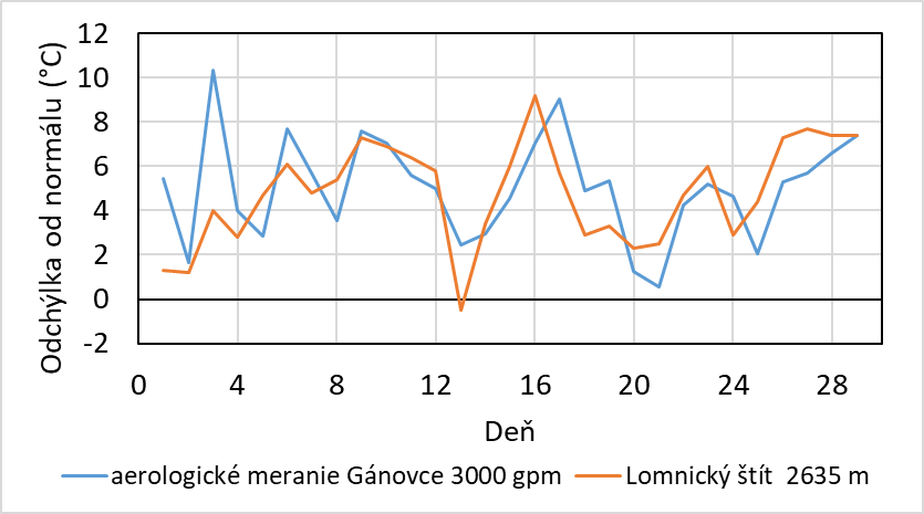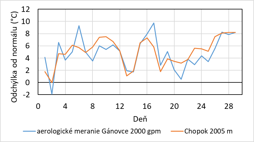 Nadnormálne teploty vzduchu sa u nás nepozorovali iba na pozemných meteorologických staniciach, ale aj vo výškovom profile atmosféry siahajúcom od zemského povrchu po hladinu 10 000 gpm (zasahovali takmer celú troposféru). Porovnanie pozemných a aerologických meraní v blízkosti zemského povrchu ukázalo konzistentnosť teploty vzduchu aj odchýlok od normálov.