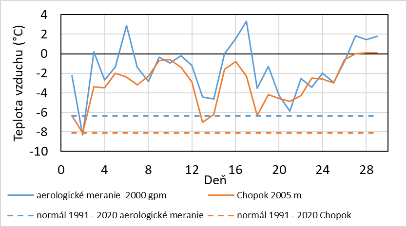 Na Chopku (2005 m n. m.) bol tohoročný februárový priemer teploty vzduchu -3,0 °C (odchýlka oproti normálu 5,1 °C) a v hladine s výškou 2000 gpm -1,5 °C (o 4,8 °C viac oproti normálu).
