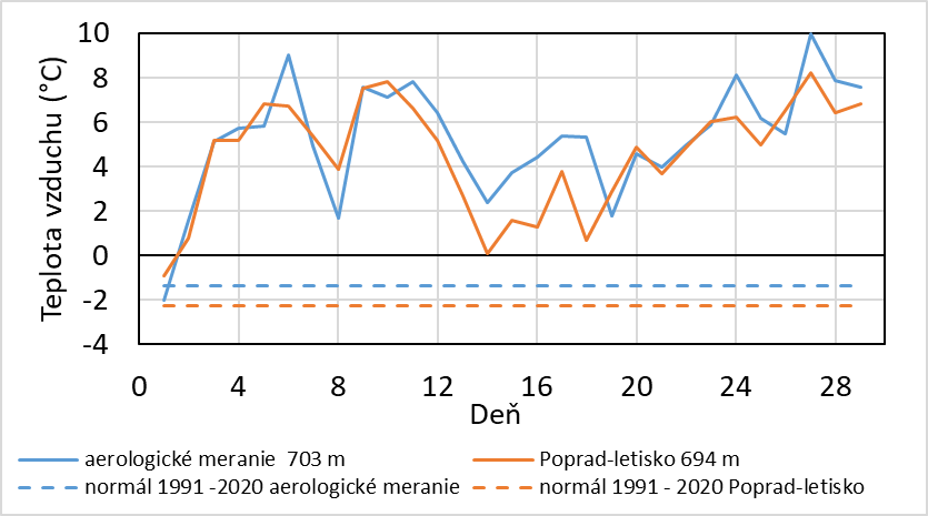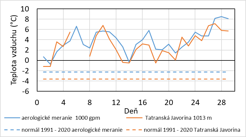 Odchýlka teploty od normálu 1991 – 2020 dosahovala väčšinou 6,0 až 7,0 °C, čo je veľmi úzky teplotný interval (Obr. 4). Táto územná rovnorodosť odchýlok naznačuje, že medzi jednotlivými oblasťami Slovenska neboli zaznamenané žiadne systematické rozdiely, ani z hľadiska geografickej polohy alebo tvaru terénu. Najväčšie odchýlky boli zaznamenané na severnom, ale aj na strednom a južnom Slovensku (Červený Kláštor 7,5 °C, Liesek 7,4 °C, Hurbanovo 7,3 °C, Kuchyňa 7,3 °C, Vígľaš-Pstruša 7,3 °C). Na našich vysokohorských staniciach boli tieto odchýlky najmenšie, o nich sa zmienime pri porovnaní teplotných údajov z pozemných meraní a v korešpondujúcich hladinách vo voľnej atmosfére.