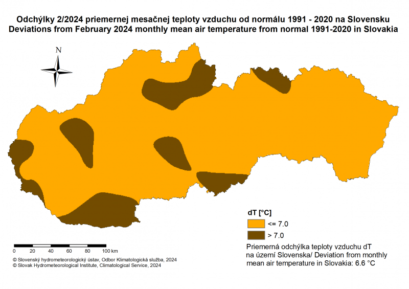 Teplotne mimoriadne nadnormálny február 2024 sa prejavil najvyšším mesačným priemerom teploty vzduchu na juhozápade nášho územia (Hurbanovo 9,1 °C, Bratislava-Mlynská Dolina 9,0 °C, Kuchyňa 8,9 °C). Na výnimočnosť tohoročnej februárovej teploty poukazuje aj fakt, že druhý najvyšší februárový priemer v Hurbanove z roku 1966 (6,5 °C) bol prekonaný o 2,6 °C a tretí z roku 2016 (6,1 °C) až o 3,0 °C (Obr. 3).