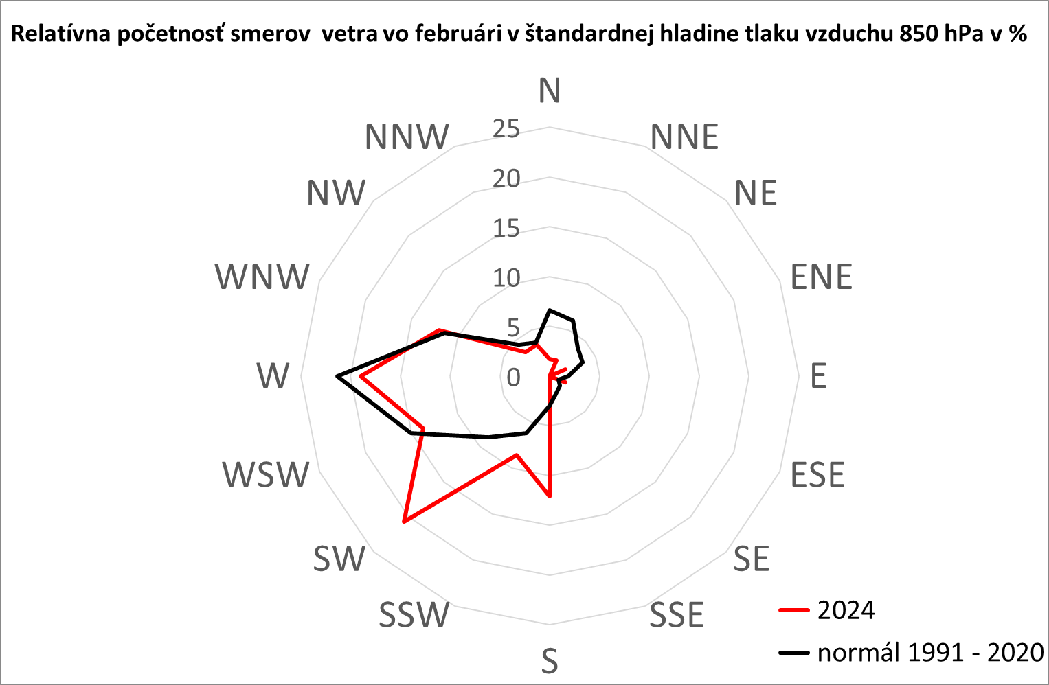 Početnosť smerov vetra v hladine 850 hPa vo februári 2024 (obr. 2) ukazuje, že oproti normálu boli potlačené východné zložky a v menšej miere severné, a naopak, početnejšie bolo prúdenie s južnými, ako aj juhozápadnými zložkami. V hladine 500 hPa bolo oproti normálu viac situácií so severozápadným ako aj s juho-juhozápadným a juhozápadným prúdením (obr. 2).