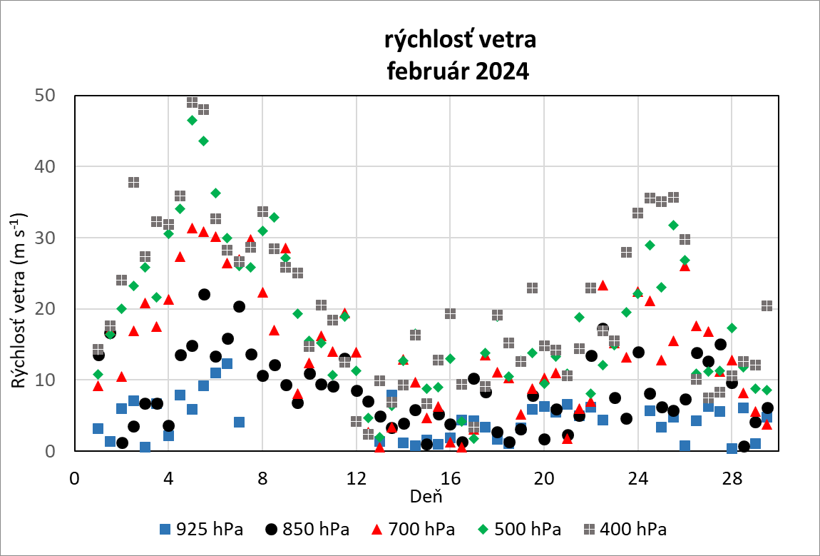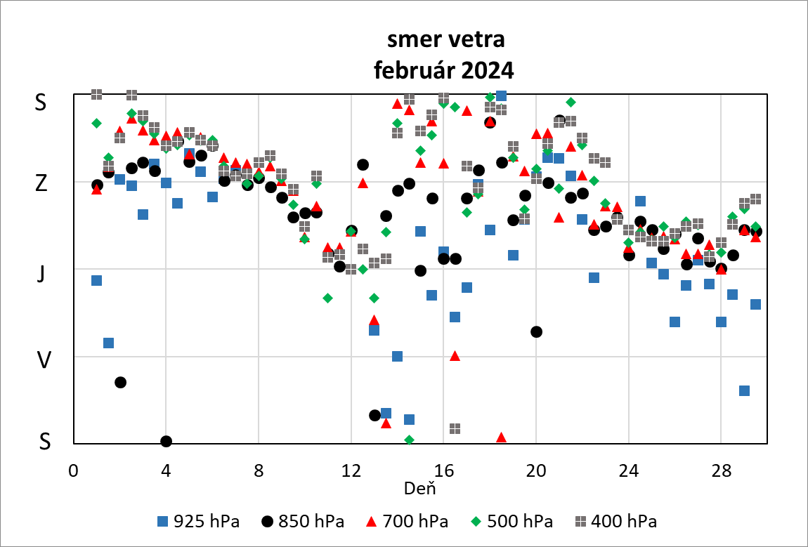 Vo februári sa vyskytli dve obdobia so silnejším vetrom: prvé okolo 5. februára, kedy medzi hladinami tlaku vzduchu 850 hPa a 400 hPa prevládal ZZS smer vetra a druhé okolo 25. februára pri JZ vetre (obr. 1). Po týchto maximách rýchlosti vetra (okolo 6. 2. a koncom mesiaca po 27.2.) boli namerané pri zemskom povrchu najväčšie kladné odchýlky teploty vzduchu od normálu.