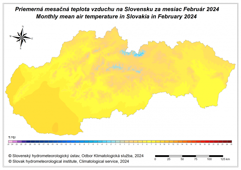 Obr. 3 Priemerná mesačná teplota vzduchu vo februári 2024 na Slovensku, zdroj: SHMÚ.