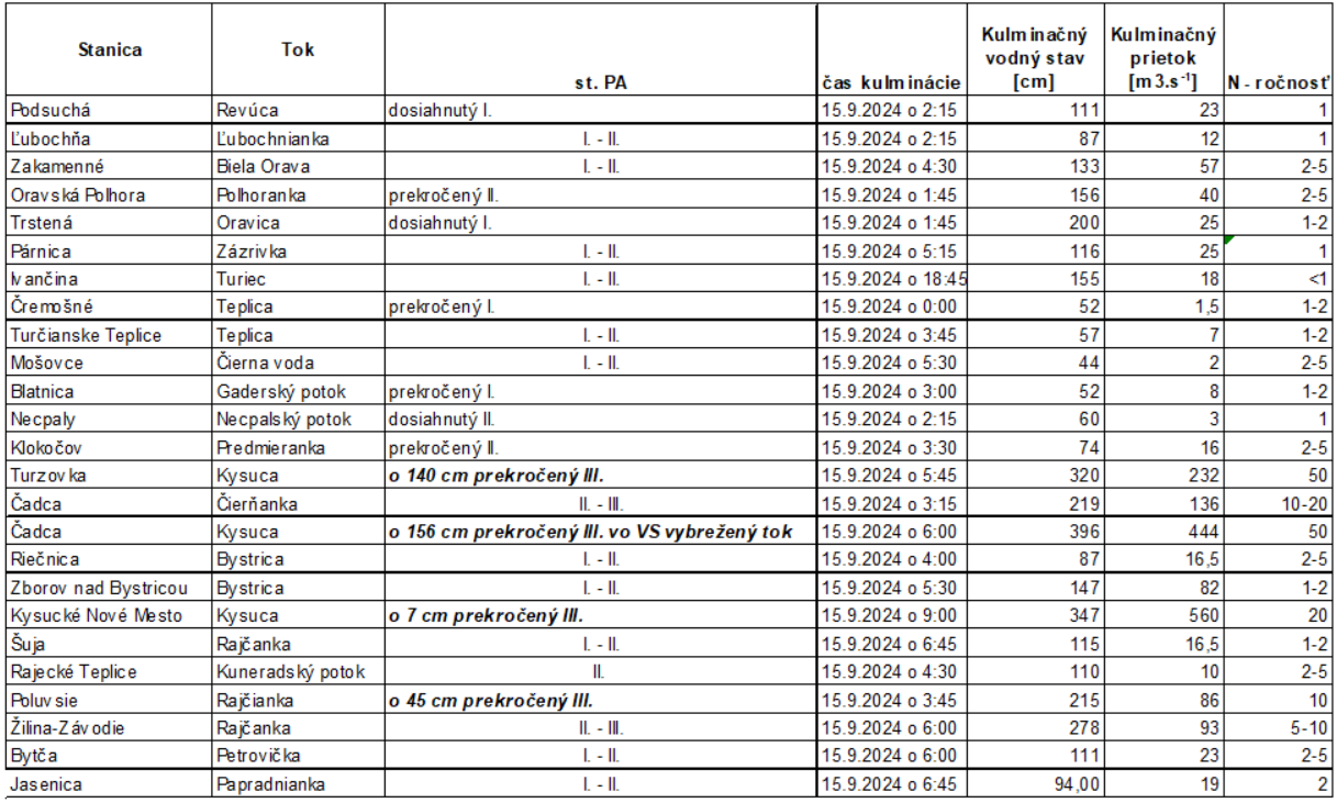 Na 25 vodomerných staniciach, ktoré monitoruje SHMÚ, regionálne pracovisko Žilina, boli dosiahnuté alebo prekročené stupne povodňovej aktivity (Tab. 1)
