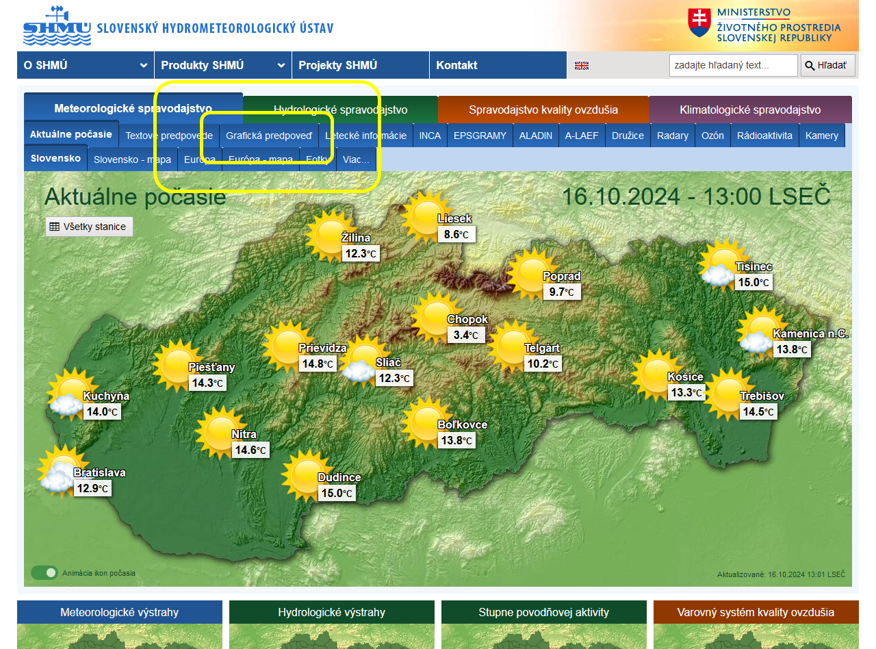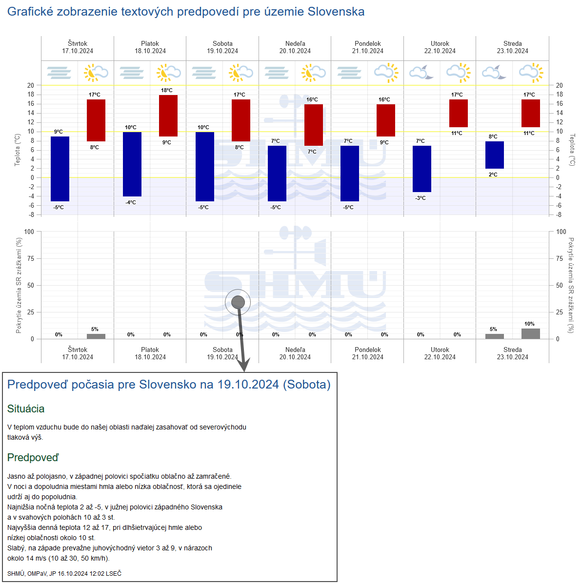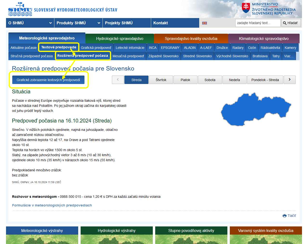 Pripravili sme pre vás zjednodušenú grafickú prezentáciu všeobecných textových predpovedí, ktoré každodenne okolo poludnia vydávajú meteorológovia SHMÚ z Odboru meteorologických predpovedí a výstrah pre obdobie na jeden týždeň dopredu. Nájdete ju na webovej stránke SHMÚ v sekcii Grafická predpoveď, prípadne ju môžete nájsť v sekcii Textová predpoveď pod kartou Rozšírená predpoveď počasia a kliknúť na Grafické zobrazenie textových predpovedí (návod v závere článku). Po kliknutí na konkrétny deň v grafe sa pod ním zobrazí textová predpoveď pre daný deň. Pre zobrazenie bodovej grafickej predpovede, ktorá sa v tejto sekcii doposiaľ zobrazovala na prvom mieste, je nutné kliknúť na kartu Slovensko.