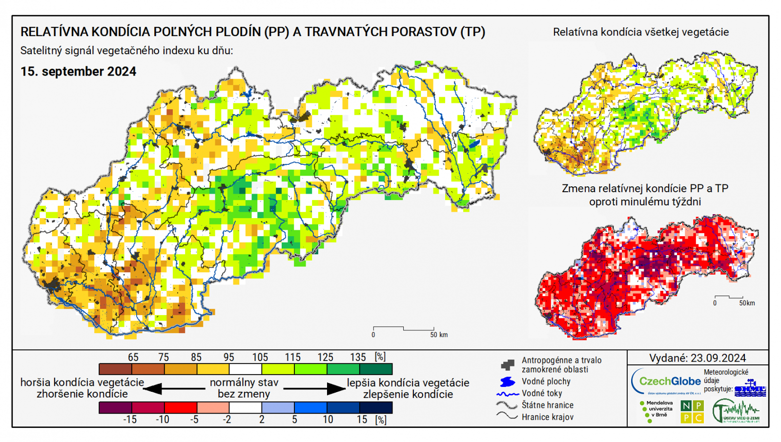 Obr. 8 Relatívna kondícia vegetácie ku dňu 15.9.2024 v čase kedy na Slovensku vrcholila suchá perióda (mapa vpravo hore)