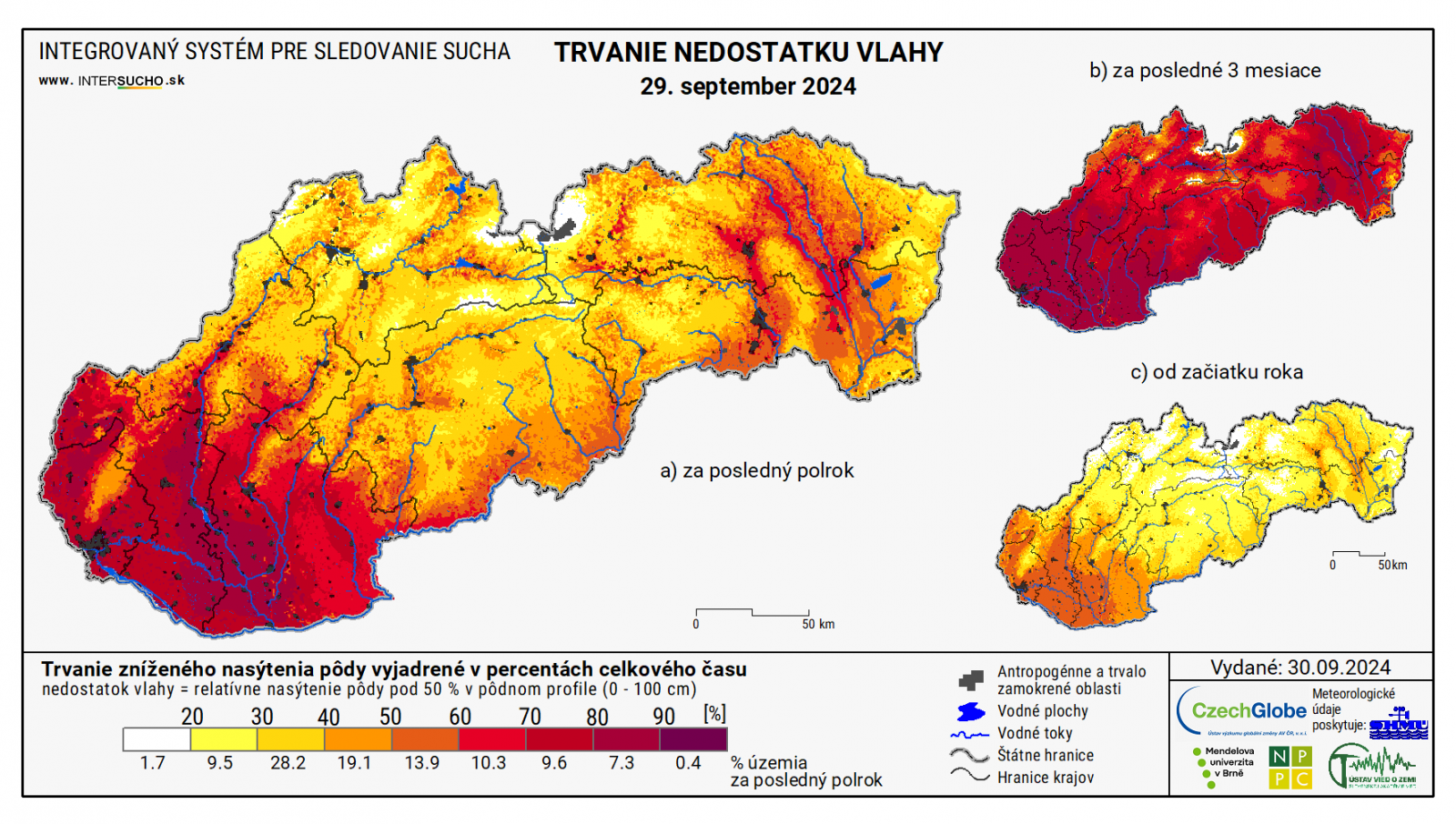 Trvanie nedostatku vlahy je dobre viditeľné na obr. 3. Vo vegetačnom období bola aspoň 40 % času stresovaná vegetácia nedostatkom vlahy až na 60 % územia Slovenska, pričom išlo najmä o územie západného a východného Slovenska (Obr. 4).