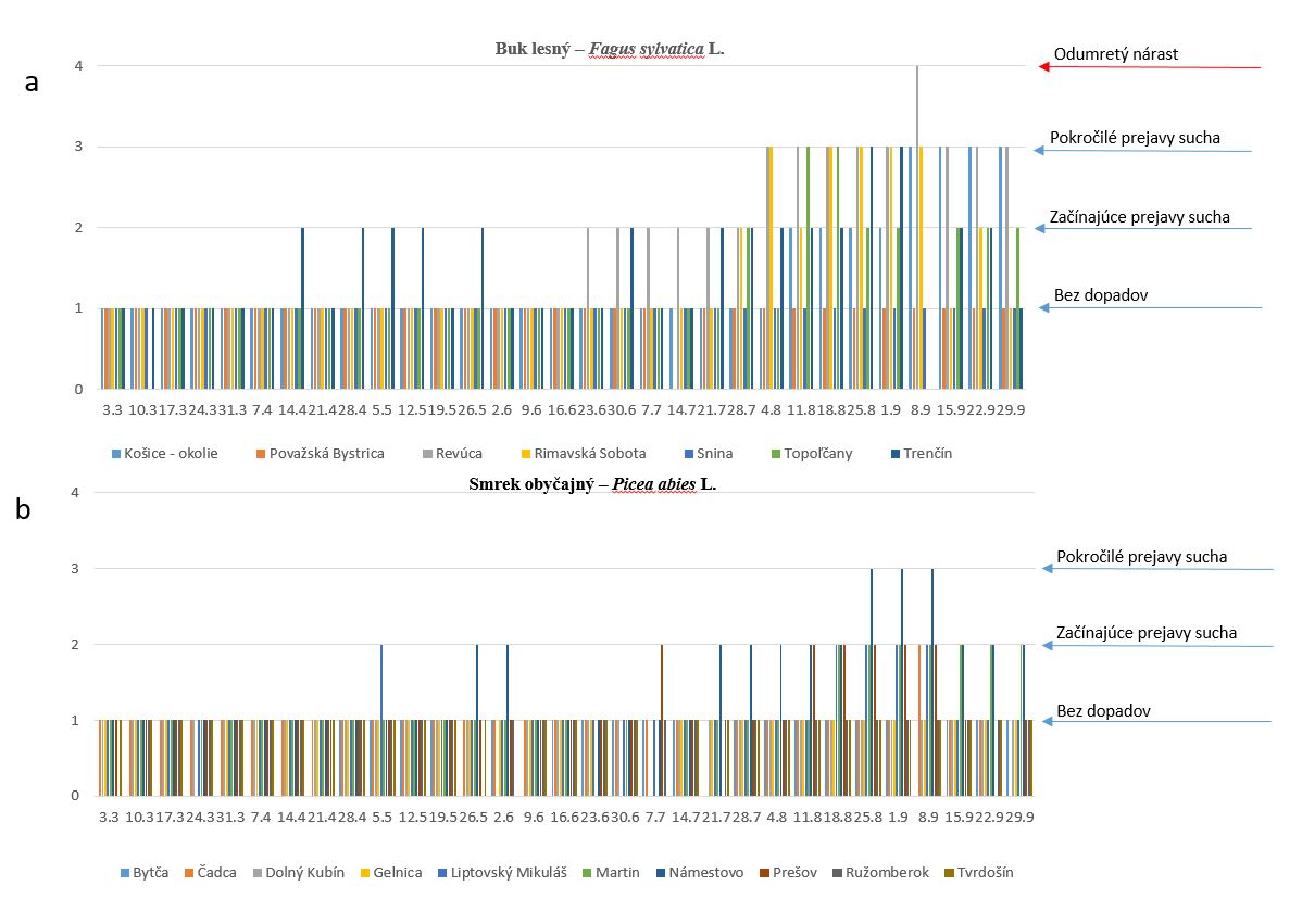 Väčšia časť vegetačného obdobia bola prakticky bez dopadov s výnimkou umelej výsadby smreka na začiatku apríla v okrese Liptovský Mikuláš, kde boli hlásené pokročilé prejavy sucha (skupiny odumierajúcich jedincov, Obr. 6a). Výraznejšie negatívne dopady sucha boli zaznamenané až na prelome júla a augusta, kde na viacerých miestach Slovenska zaznamenali pokročilé prejavy sucha až zlyhanie výsadieb, napríklad pri smreku v okrese Ružomberok a Revúca, pri buku v okrese Žarnovica. Zlyhanie výsadieb bolo zaznamenané aj na iných drevinách. Negatívne dopady sucha sa prejavili najmä v čase, kedy lesníci hodnotili najnižšiu zásobu vody v pôde v kategórii od silného sucha až po extrémne.