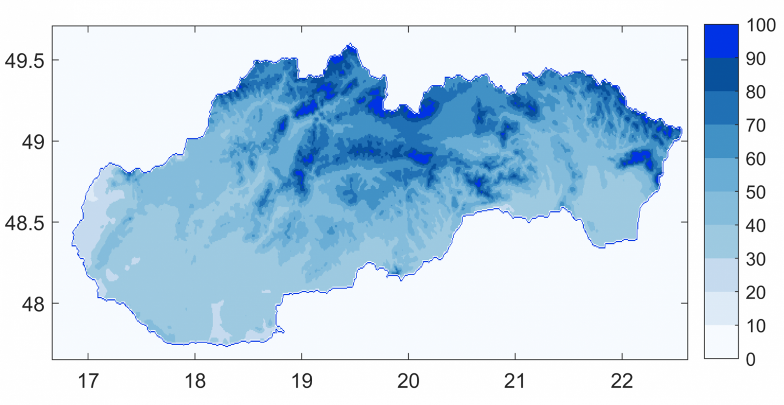 ▲ Obr. 1: Klimatická pravdepodobnosť výskytu [%] celkovej snehovej pokrývky s výškou 1 cm a viac v období 1981 − 2020; prevzaté z "Aká je dlhodobá pravdepodobnosť "bielych Vianoc" na Slovensku?" (Pecho & Onderka, 2021).