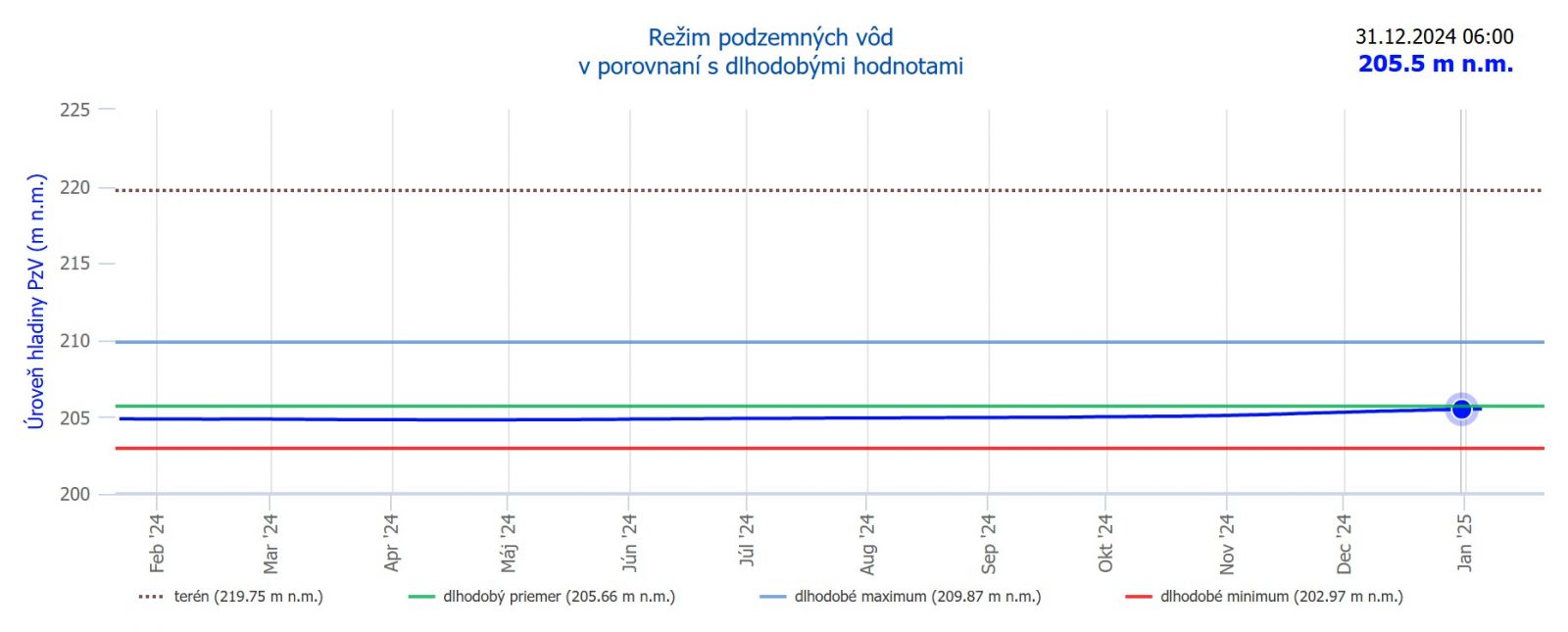 Opačná situácia prevládala na severovýchode Slovenska v povodí Bodrogu. V objekte č. 3346 Stropkov - Sitník už niekoľko mesiacov pozorujeme postupný pokles hladiny podzemnej vody, pričom 6.12.2024 sme zaznamenali podkročenie dlhodobej minimálnej hodnoty (178,84 m n. m., Obr. 7).