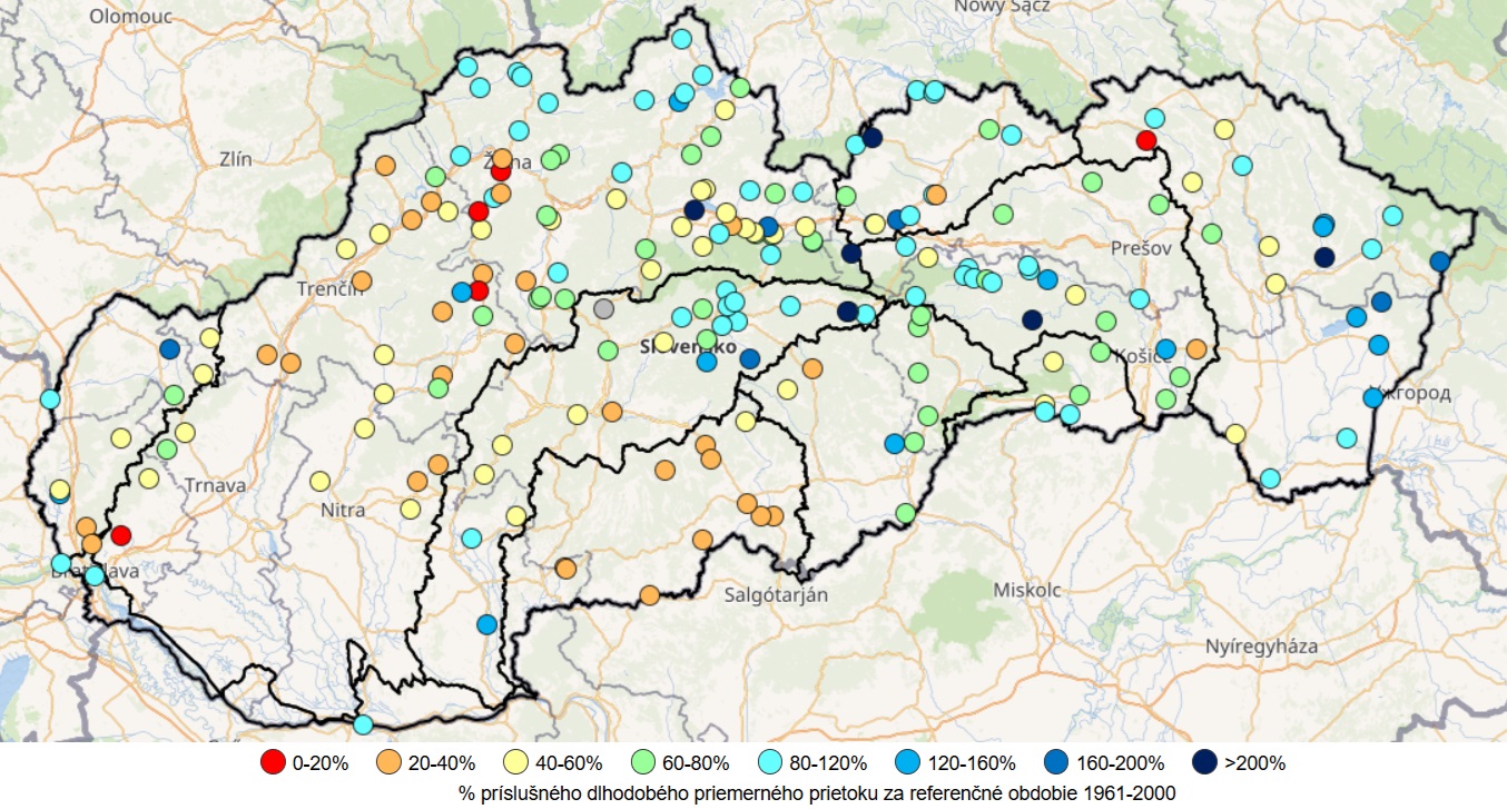 Z hľadiska posúdenia priemerných denných prietokov (Qd) na začiatku mesiaca v hodnotených VS bola nepriaznivá hydrologická situácia (pokles až na úroveň 355-364-denných prietokov, ojedinele aj menej ako Q364d) v oblasti hornej a strednej časti povodia Váhu, Bodrogu a Dunajca a Popradu. V ostatnej časti územia boli Qd prevažne v rozmedzí Q270-330d až Q90-180d. (Obr. 2).