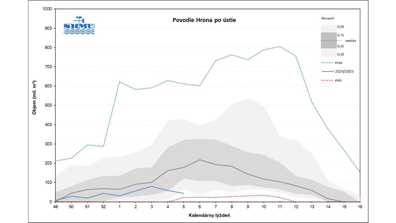 Obr. 5 Minimálne zásoby vody viazanej v snehovej pokrývke v povodí Hrona v závere januára 2025