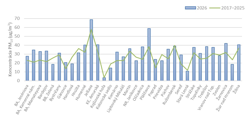 V januári 2026 bol výstražný prah pre PM10 prekročený najdlhšie v Košiciach na Štefánikovej 19 hodín, vo Veľkej Ide a Jelšave 14 hodín a v Humennom 12 hodín.