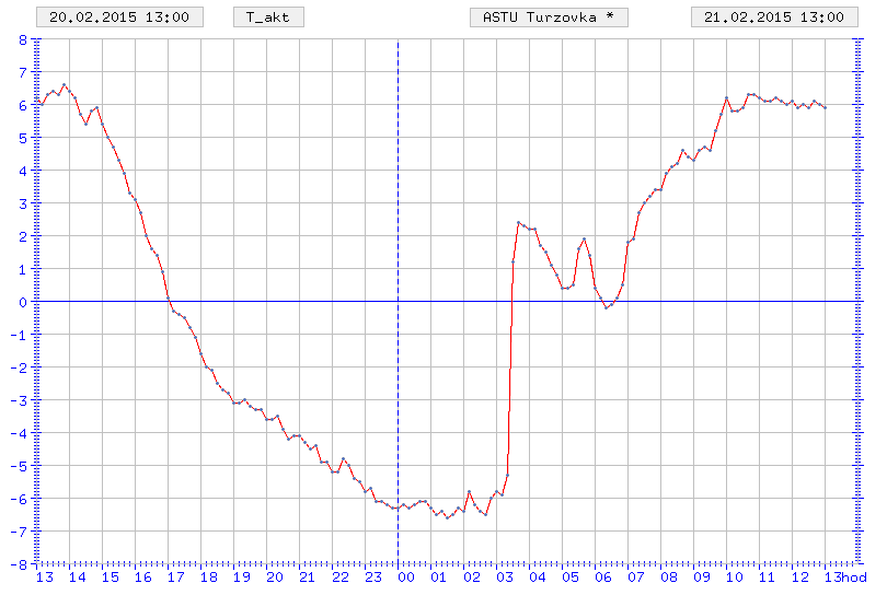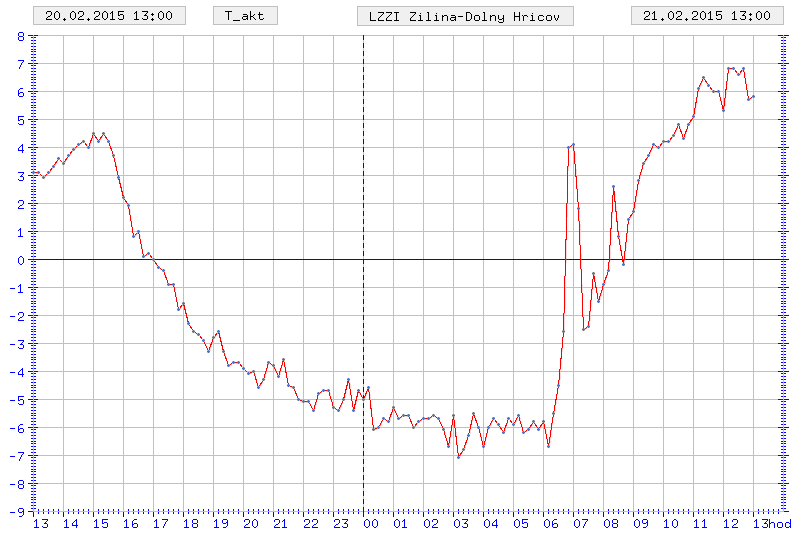 Včera večer boli tieto podmienky vhodné najmä v Žilinskom a Trenčianskom kraji, na Horehroní a na Spiši. Vzduch bol pomerne suchý, bolo takmer jasno a väčšinou bezvetrie. Teplota tak pri západe slnka začala rýchlo klesať. Postupne však miestami začal fúkať vietor a teplota následne stúpla (neskôr pribudla aj oblačnosť, no oproti vetru mala len nepatrný vplyv na teplotu). Oteplenie sa najvýraznejšie prejavilo v Turzovke (obr. 1), v Liptovskom Mikuláši (obr. 2) a v Dolnom Hričove (obr. 3), kde v priebehu 10 minút teplota stúpla o 6-7 °C, pričom tento náhly vzostup teploty zreteľne korešpondoval s nárazmi vetra.