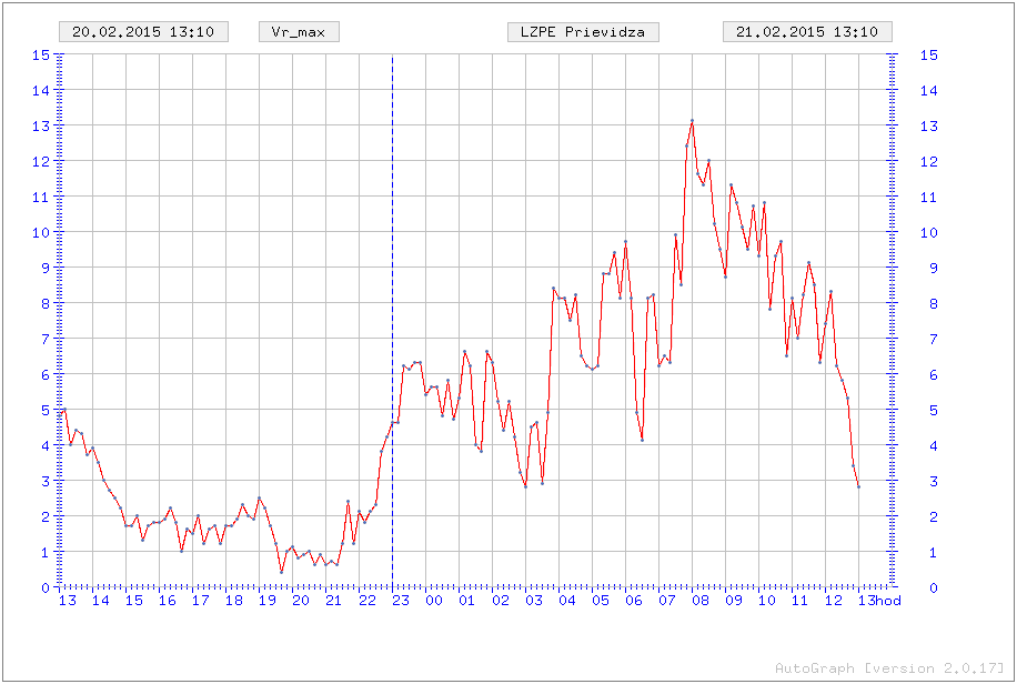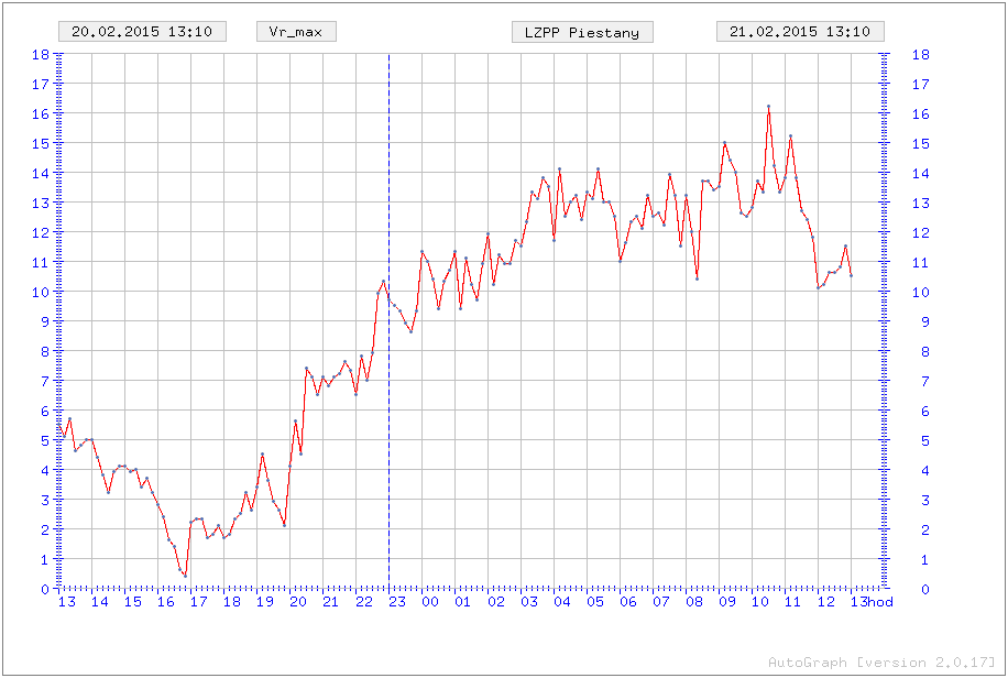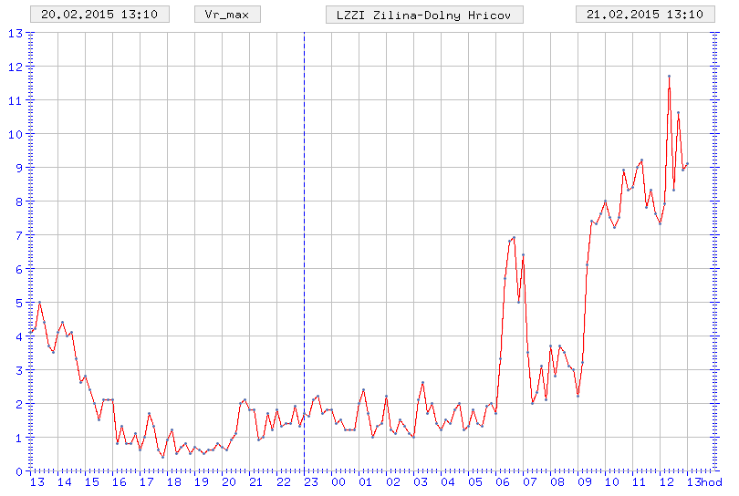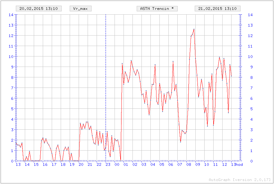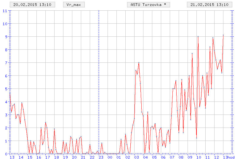 Obr. 1 - Priebeh teploty [°C] a nárazov vetra [m/s] v Turzovke.