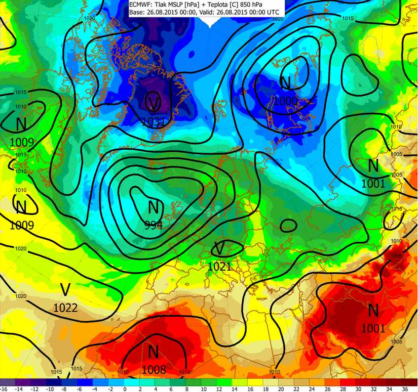Obr. 2a - Analýza teploty v hladine 850 hPa (výška cca 1500 m) a prízemného tlakového poľa (čierne izobary) modelu ECMWF, 28.8.2015. Červená šípka znázorňuje prúdenie teplého tropického vzduchu do strednej Európy od juhozápadu po prednej strane tlakovej níže nad Atlantickým oceánom.