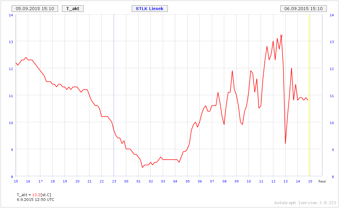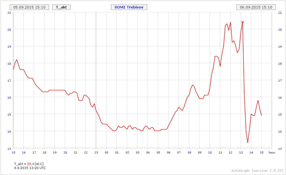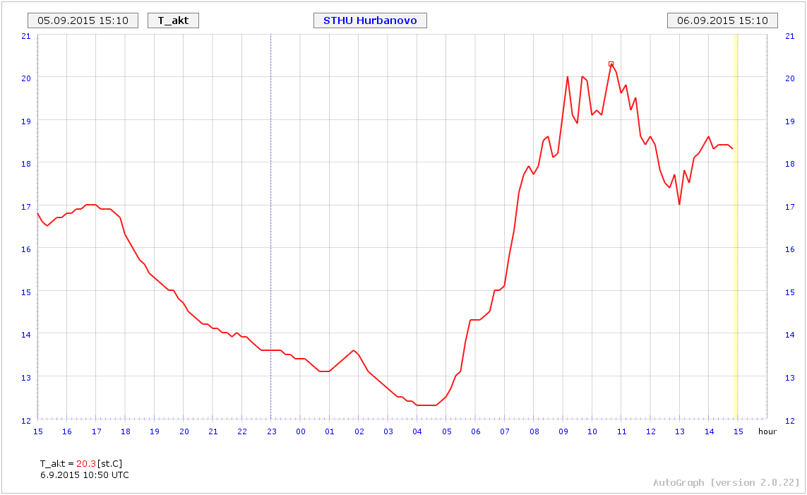 Záver leta 2015 a začiatok jesene bolo na našom území mimoriadne až extrémne teplo. Posledná vlna horúčav priniesla veľké množstvo rekordov. Na našom území teplota pravidelne vystupovala nad 35 °C, s maximom 37,0 °C v Čaklove, čo je na prelom augusta a septembra nevídaný extrém. Horúčavy však v úvode septembra rýchlo skončili. V tom istom týždni sa na našom území tak výrazne ochladilo, že v nedeľu 6.9. bola maximálna teplota vzduchu na juhu len okolo 20 °C (Hurbanovo, Trebišov), no napr. na severe v Liesku len 13 °C. Zmenu v počasi vidieť aj na obr. 1 na priebehu teploty z Lomnickeho štítu, kde sa az uplynulý týždeň postupne ochladilo zo 17 na -4 °C.