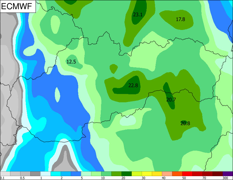 Vo vlhkom vzduchu sa u nás budú často vyskytovať zrážky, predovšetkým na západe a v južnej polovici stredného Slovenska, kde môžu byť ojedinele aj výdatné (obr. 2). Trvalé zrážky by u nás mali ustať v nedeľu (ani sobota však v obr. 2 nie je zobrazená, pretože lokálne modely ALADIN a DWD sú počítané len pre nasledujúcich 72 hodín, TU sú úhrny v sobotu z modelu ECMWF). Násobne viac zrážok však bude v okolí Jadranu, kde budú zrážkové úhrny počítať v stovkách mm.