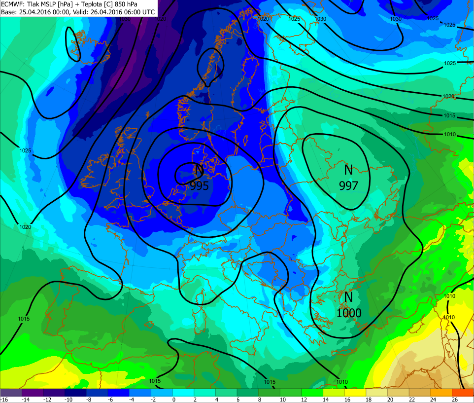 Predpoveď prízemného tlakového poľa a teploty v hladine 850 hPa z modelu ECMWF na 26.4.2016, 06:00 UTC.
