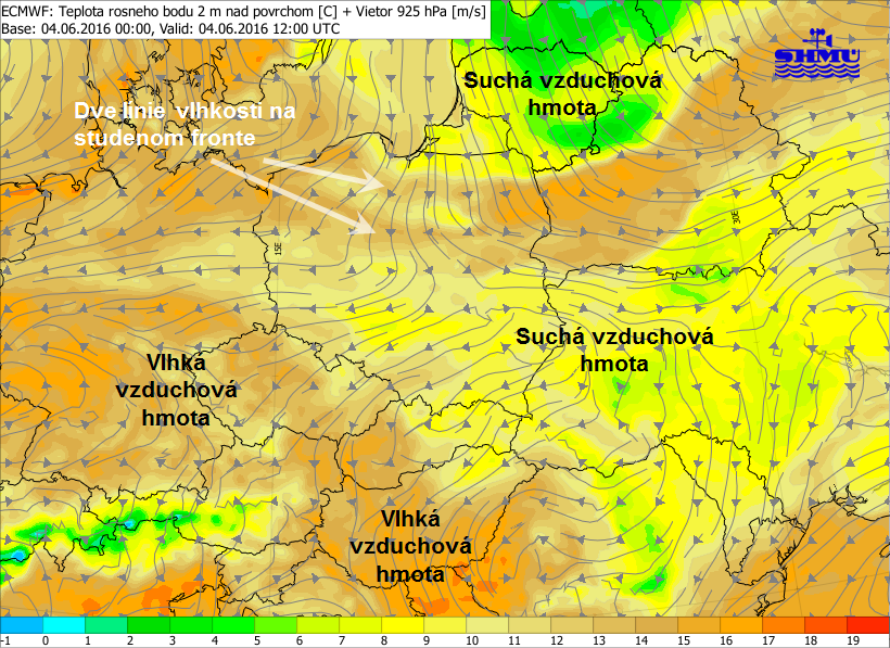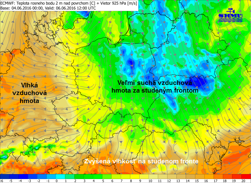 Animácia teploty rosného bodu vo výške 2 m nad povrchom (vlhkostná charakteristika) a prúdenia v hladine 925 hPa (výška cca 700 m n.m.)