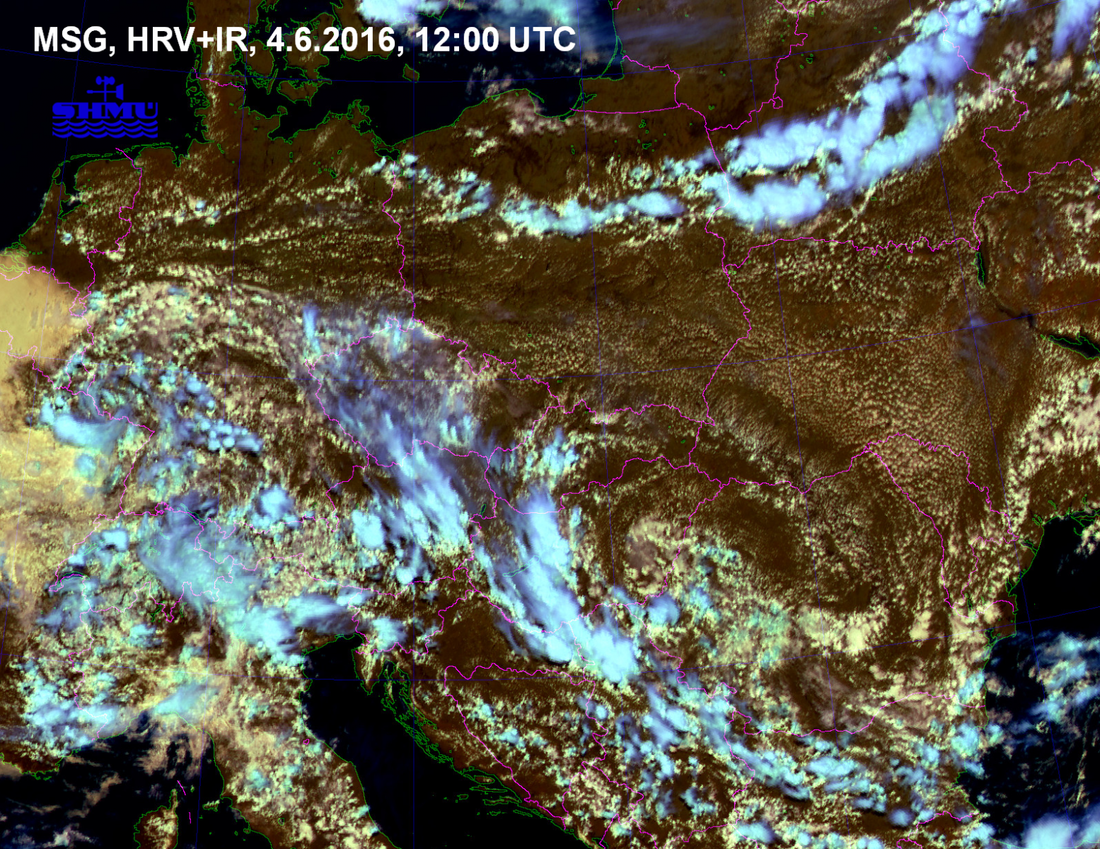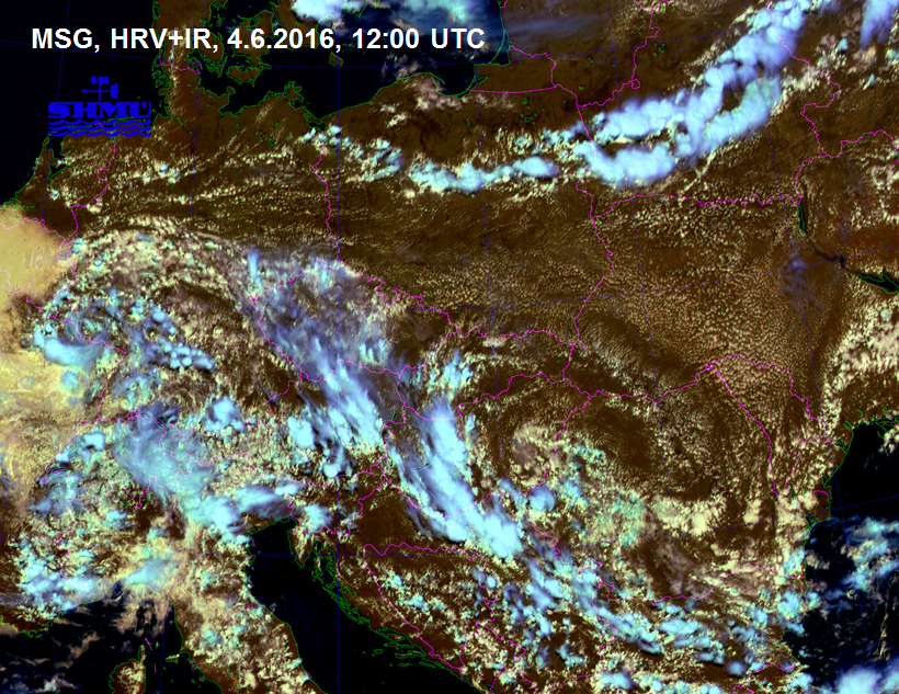 Obr. 1 - Snímka z družice MSG, HRV+IR, 4.6.2016, 12:00 UTC (v plnom rozlíšení TU).