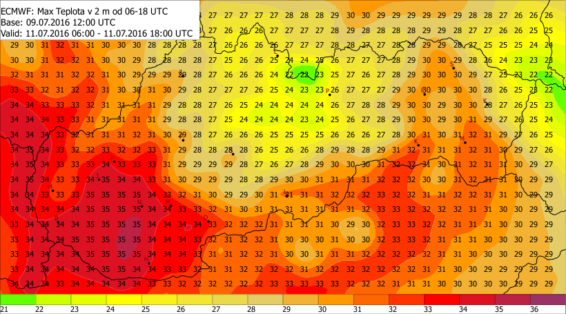 Obr. 2a - Pravdepodobnosť maximálnej dennej teploty nad 35 °C z modelu ECMWF na pondelok 11.7.2016.