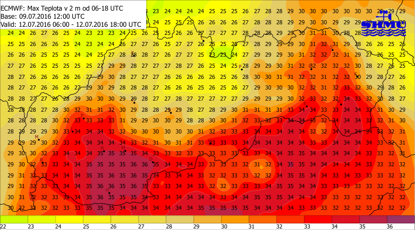 Obr. 2b - Pravdepodobnosť maximálnej dennej teploty nad 35 °C z modelu ECMWF na utorok 12.7.2016.