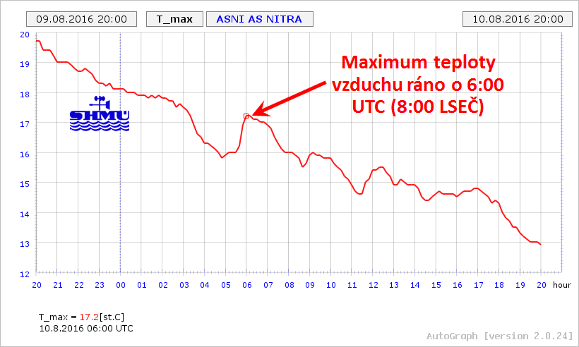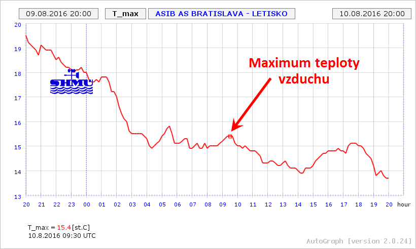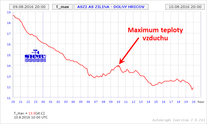 Obr. 1 - Priebeh teploty vzduchu a zvýraznené maximum na stanici Hurbanovo 10.8.2016.