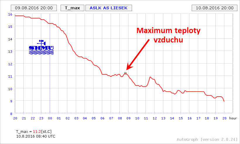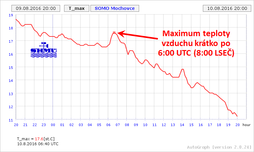 V stredu 10.8. prechádzal cez Slovensko ďalej na východ výrazný zvlnený studený front. Priniesol zrážky, po jeho prechode aj silnejší severný vietor, no výrazný bol predovšetkým ochladením. Vzostupu teploty počas dňa bránila oblačnosť, trvalé zrážky a natekanie studeného vzduchu od severozápadu na naše územie. Na niektorých miestach sa tak počas celého dňa len ochladzovalo, teda teplota dosiahla maximum ráno, prípadne dopoludnia (maximum teploty v intervale 6-18 UTC). Najlepším príkladom je stanica Hurbanovo (obr. 1), kde bolo najteplejšie hneď ráno a počas celého dňa sa len ochladzovalo. Podobne to však bolo aj na iných miestach západného Slovenska a Žilinského kraja (priebeh teploty napr. zo staníc Liesek, Dolný Hričov, Nitra, Mochovce, Bratislava letisko). Bolo veľmi chladno, keďže maximá teploty počas dňa boli v intervale len 10 až 18 °C. Navyše deň predtým bolo v tejto oblasti 26-31 °C, teda zo dňa na deň sa ochladilo o 12 až 16 °C.