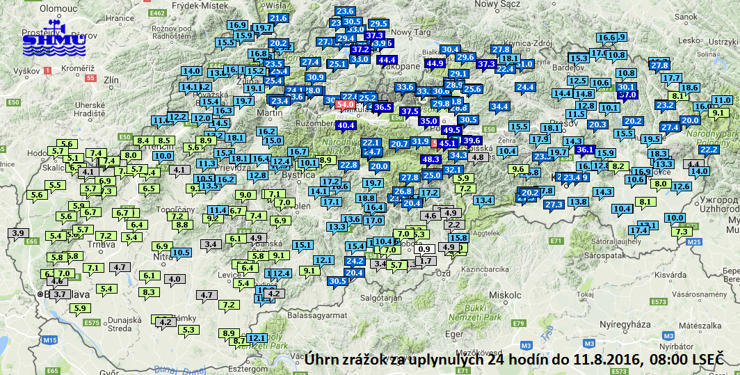Do Banskobystrického kraja sa studený vzduch dostával len pomalšie, keďže od severozápadu a severu je obklopený horami, navyše front sa tu vlnil. Na Gemeri a na východe však bola situácia odlišná. Od rána bolo ešte málo oblačnosti a pred frontom sa tam stále nachádzal teplý vzduch. Na Spiš a Šariš sa front dostal už dopoludnia (čiastočne aj na Gemer), a tak sa tu výrazne neoteplilo - od 17 °C v Podolínci do 24 v Spišských Vlachoch či v Prešove. Cez zvyšok tejto oblasti však front postupoval neskôr, zväčša až popoludní, a tak teplota pred ním ešte stihla vystúpiť na zväčša letné až tropické hodnoty, 24 až 30 °C (tropický deň (teda deň s Tmax > 30 °C) sme zaznamenali na staniciach Orechová, Vysoká nad Uhom a Leles). Ochladenie po prechode frontu tak bolo o to razantnejšie (obr. 3a), navyše aj výrazne zosilnel vietor (obr. 3b). V istú dobu tak bolo v rámci východného Slovenska teplota veľmi rozdielna, napr. o 14:40 LSEČ bolo od 12 °C na Spiši do 30 °C na Východoslovenskej nížine (obr. vpravo hore). Maximá na jednotlivých stanciach na našom území sú na obr. 4. Front priniesol aj výdatnejšie zrážky najmä do okolia Tatier a Nízkych Tatier, pri búrkach však ojedinele napršalo viac aj inde (zrážkové úhrny za uplynulých 24 hodín do 11.8.2016 8:00 LSEČ).